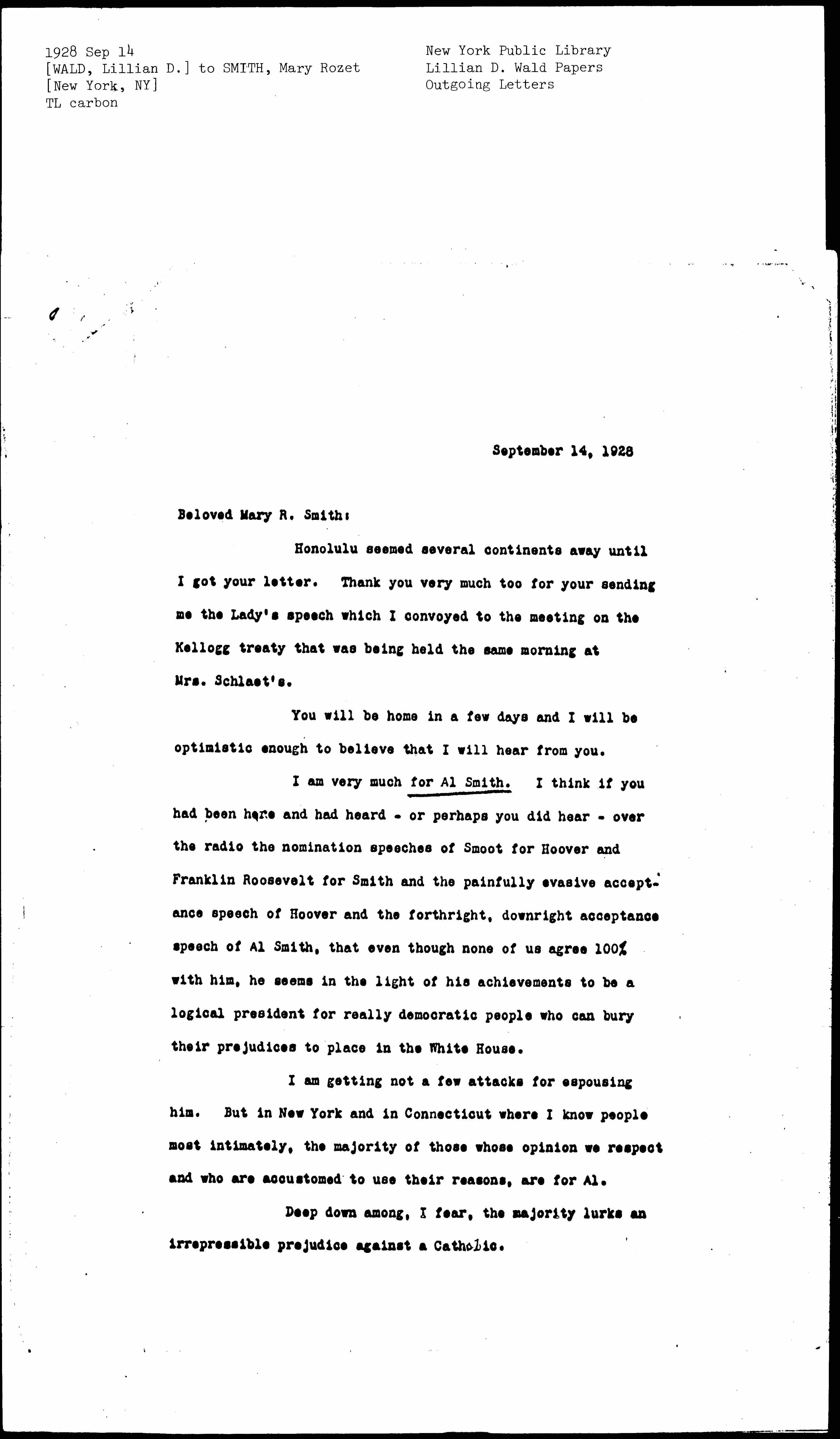 Lillian D. Wald to Mary Rozet Smith, September 14, 1928