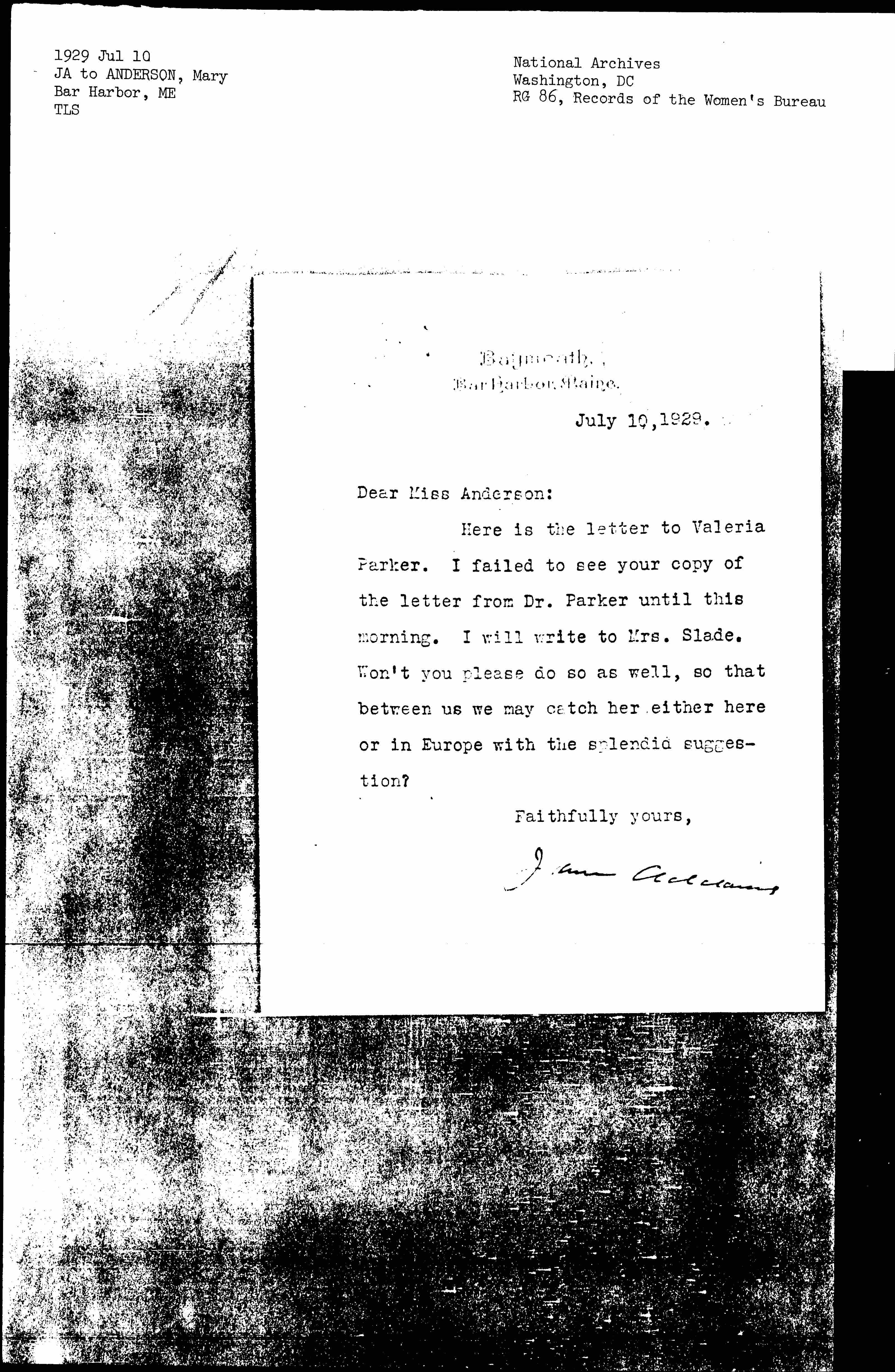 Jane Addams to Mary Anderson, July 10, 1929