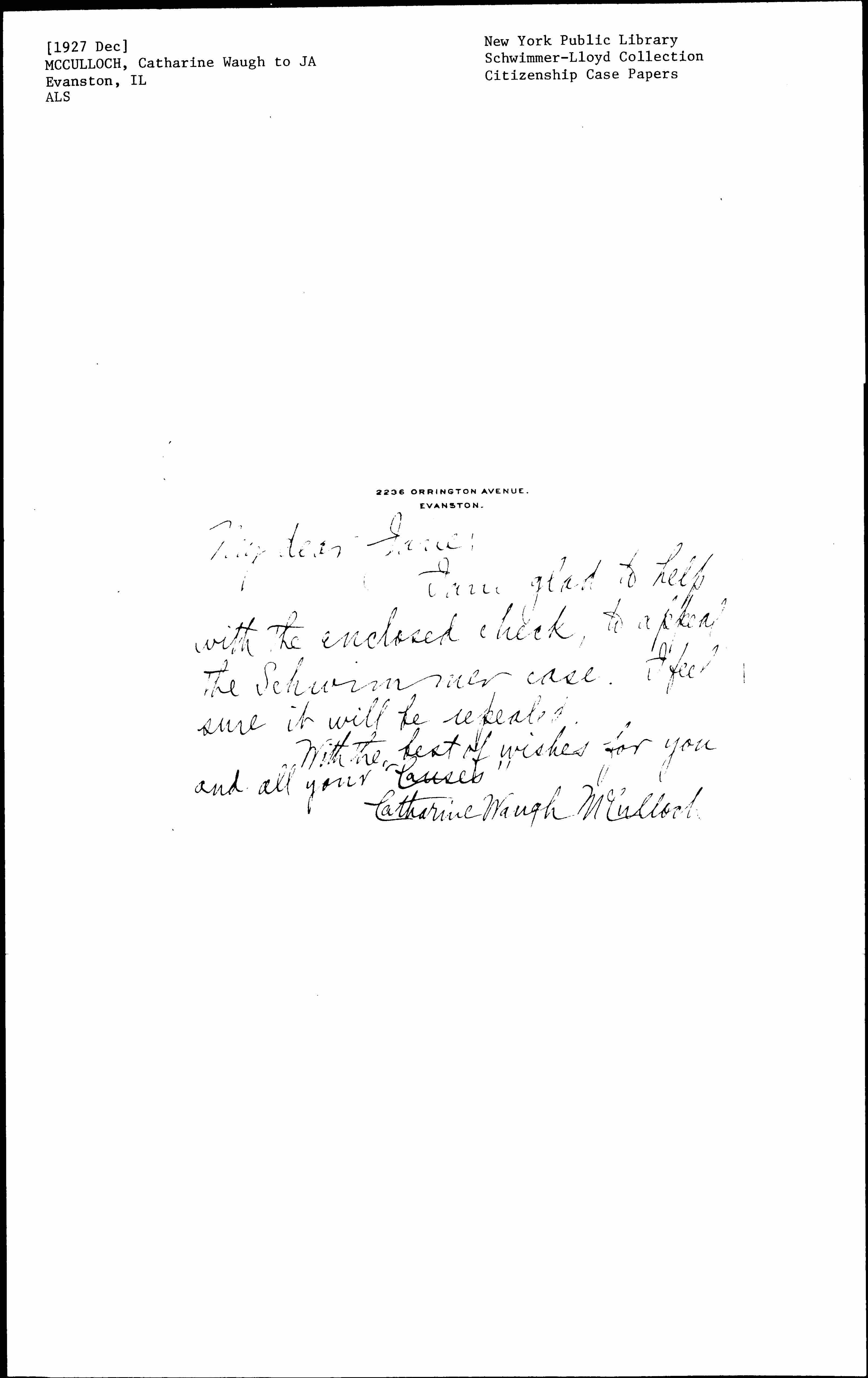 Catharine Waugh McCulloch to Jane Addams, December 1927