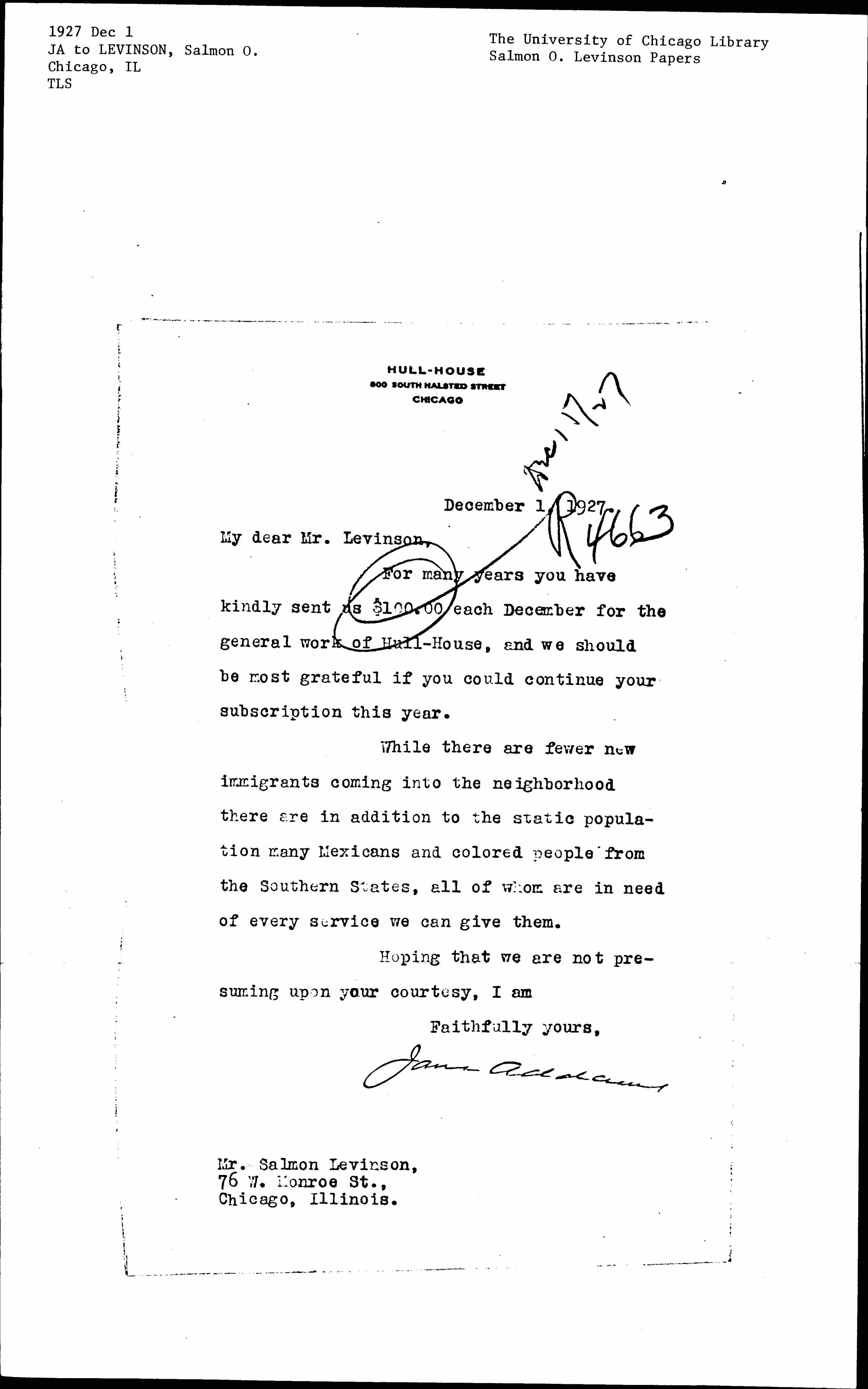 Jane Addams to Salmon Oliver Levinson, December 1, 1927