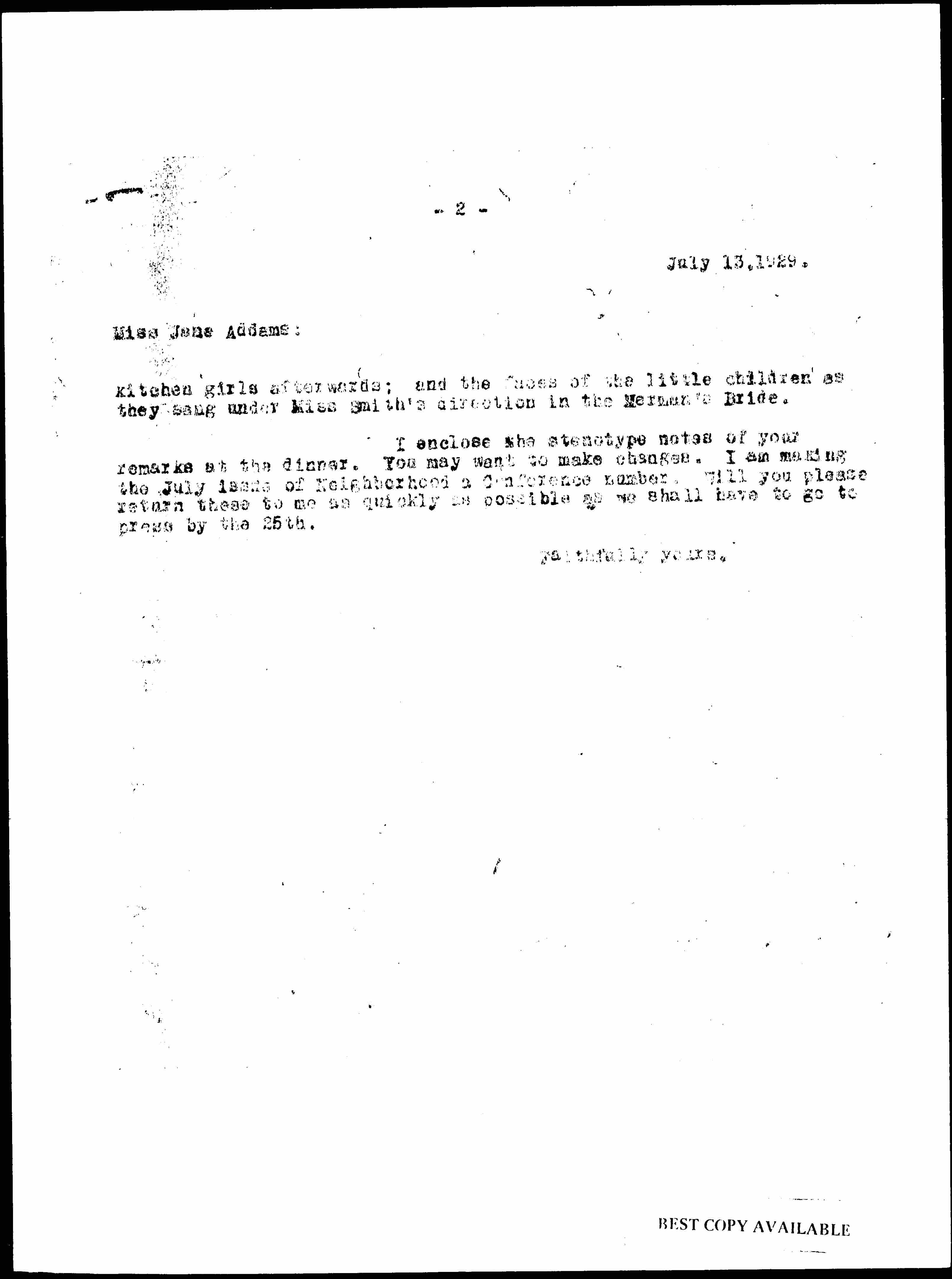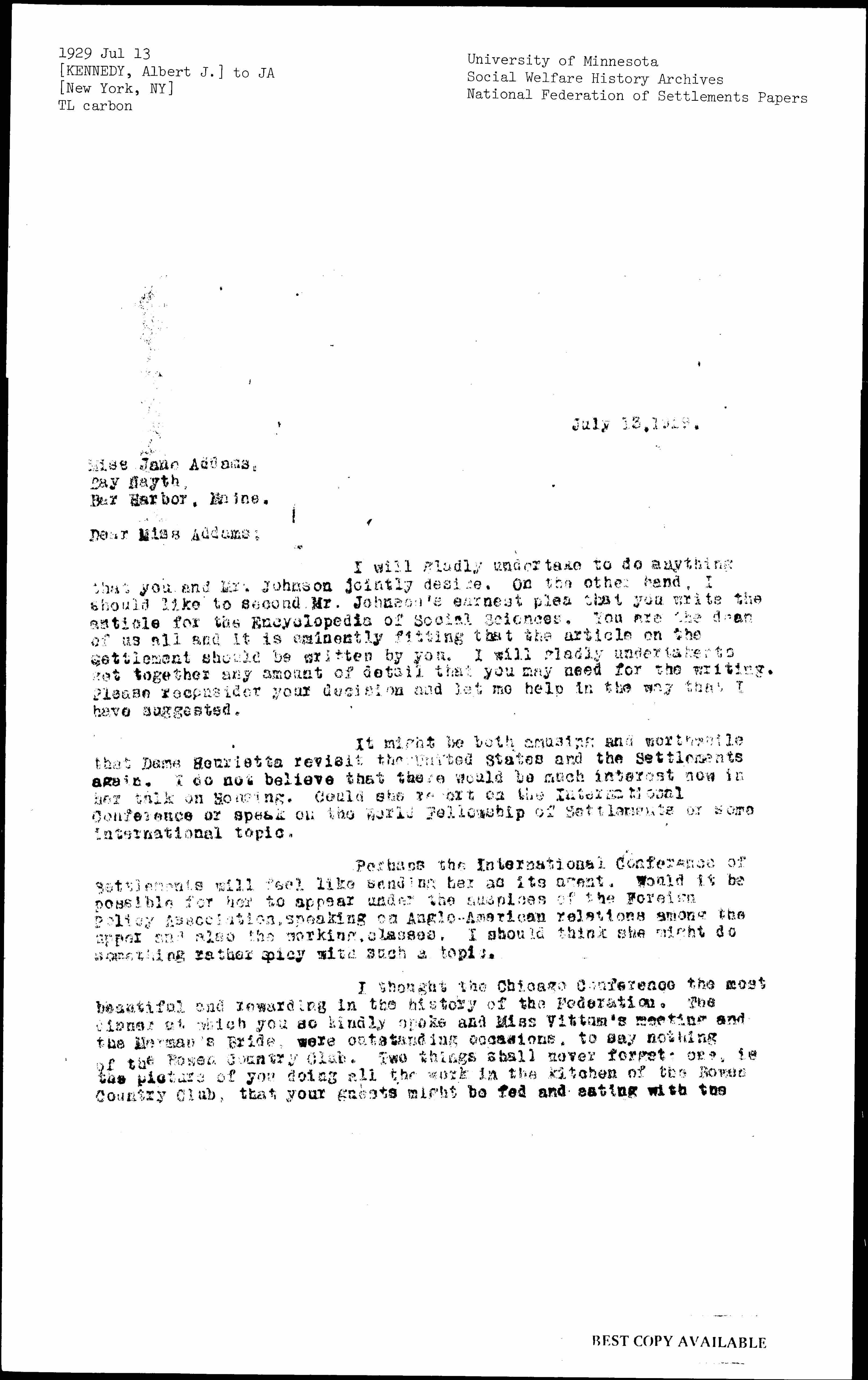 Albert Joseph Kennedy to Jane Addams, July 13, 1929