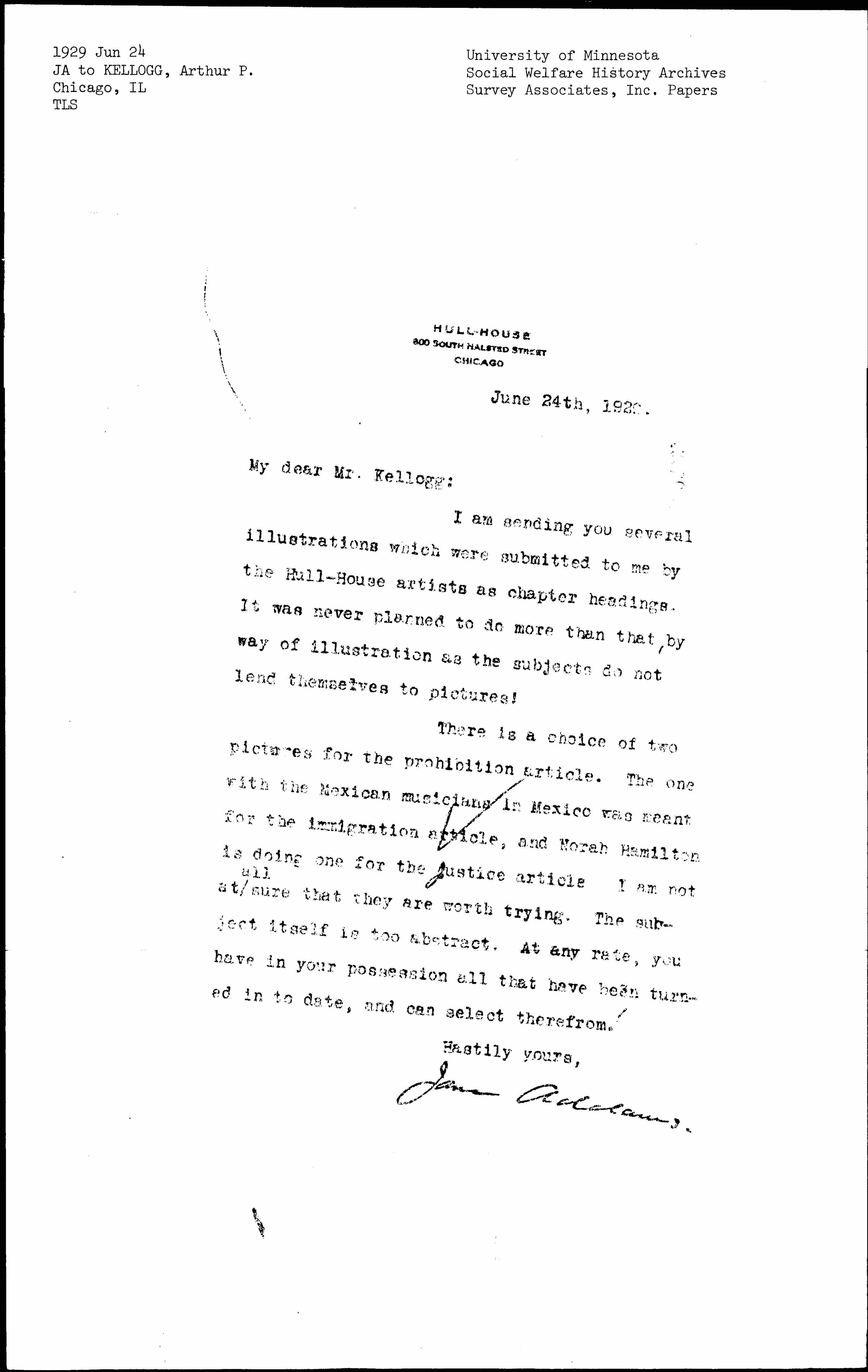 Jane Addams to Arthur Piper Kellogg, June 24, 1929