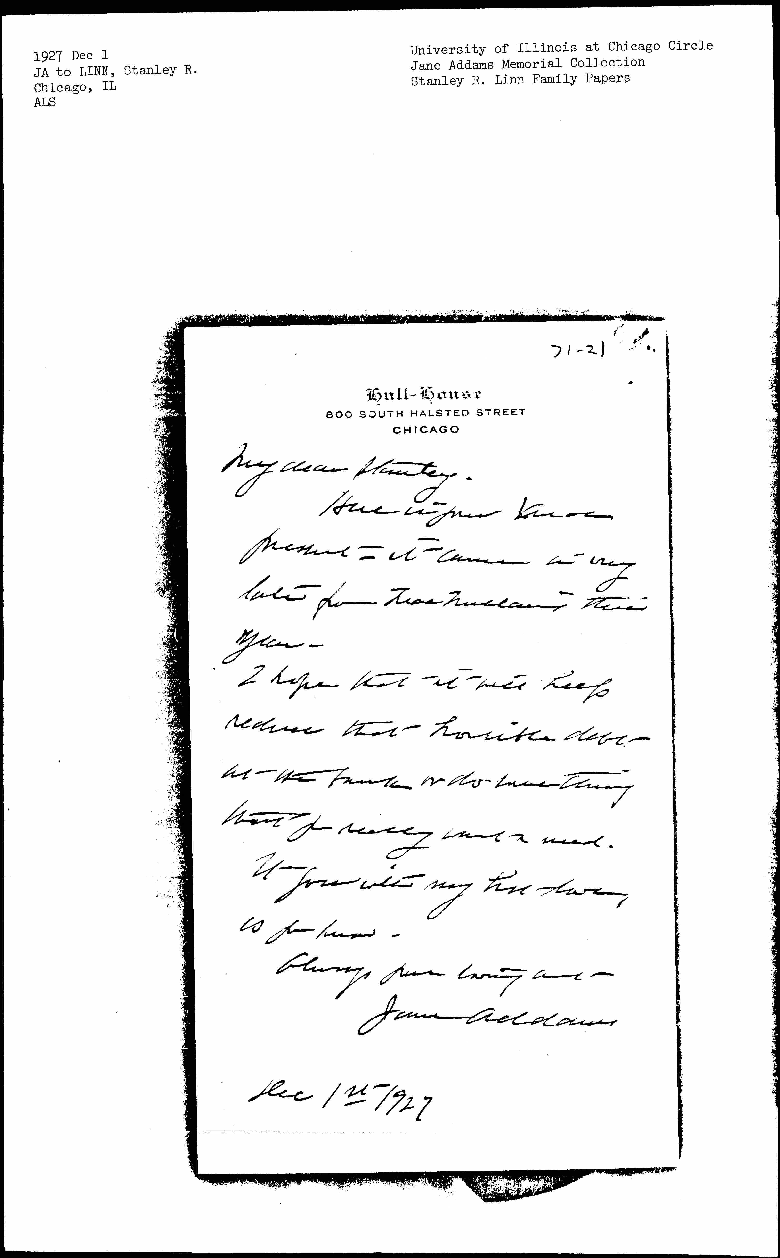Jane Addams to Stanley Ross Linn, December 1, 1927