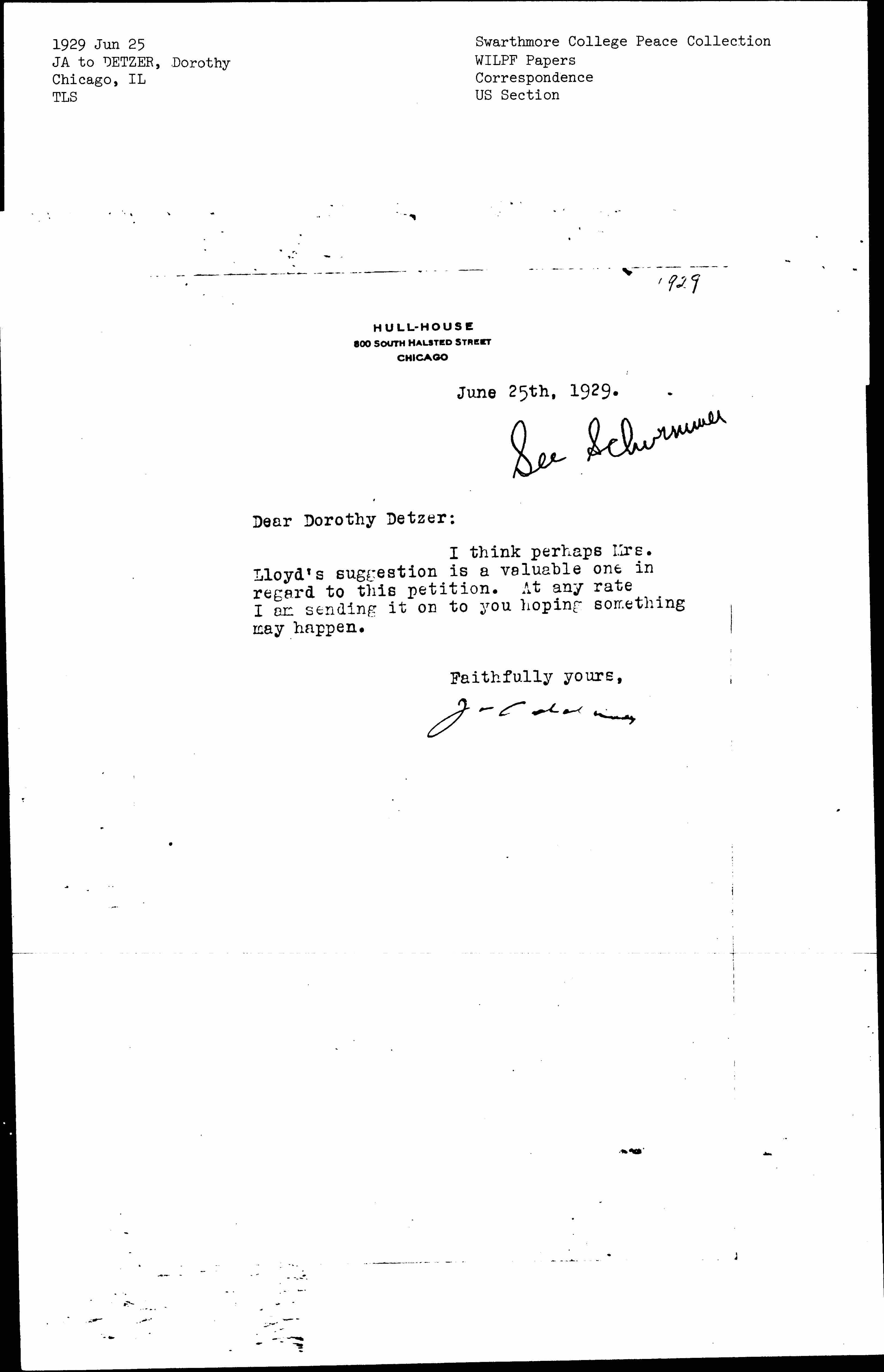 Jane Addams to Dorothy Detzer, June 25, 1929.
