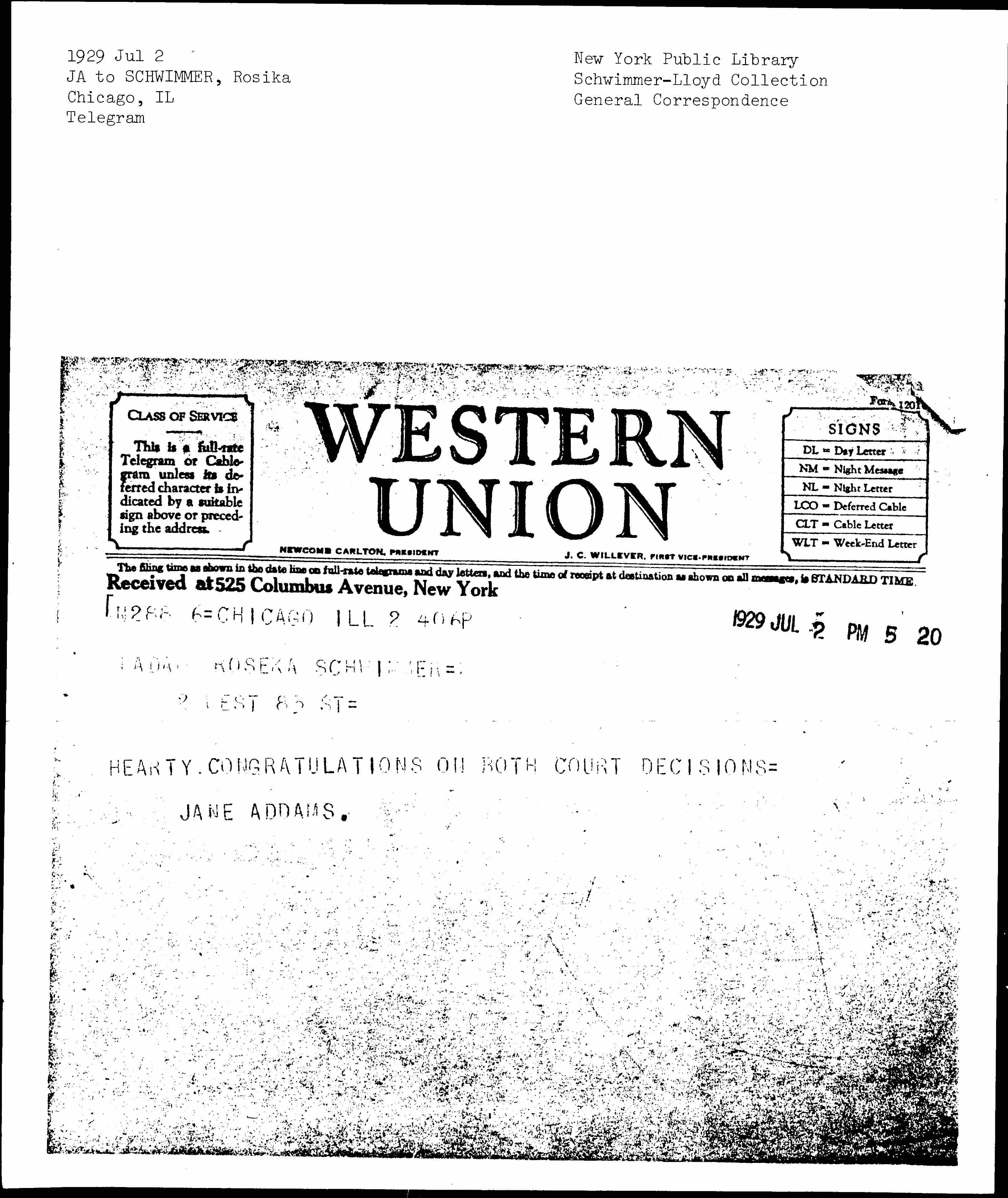 Jane Addams to Rosika Schwimmer, July 2, 1929