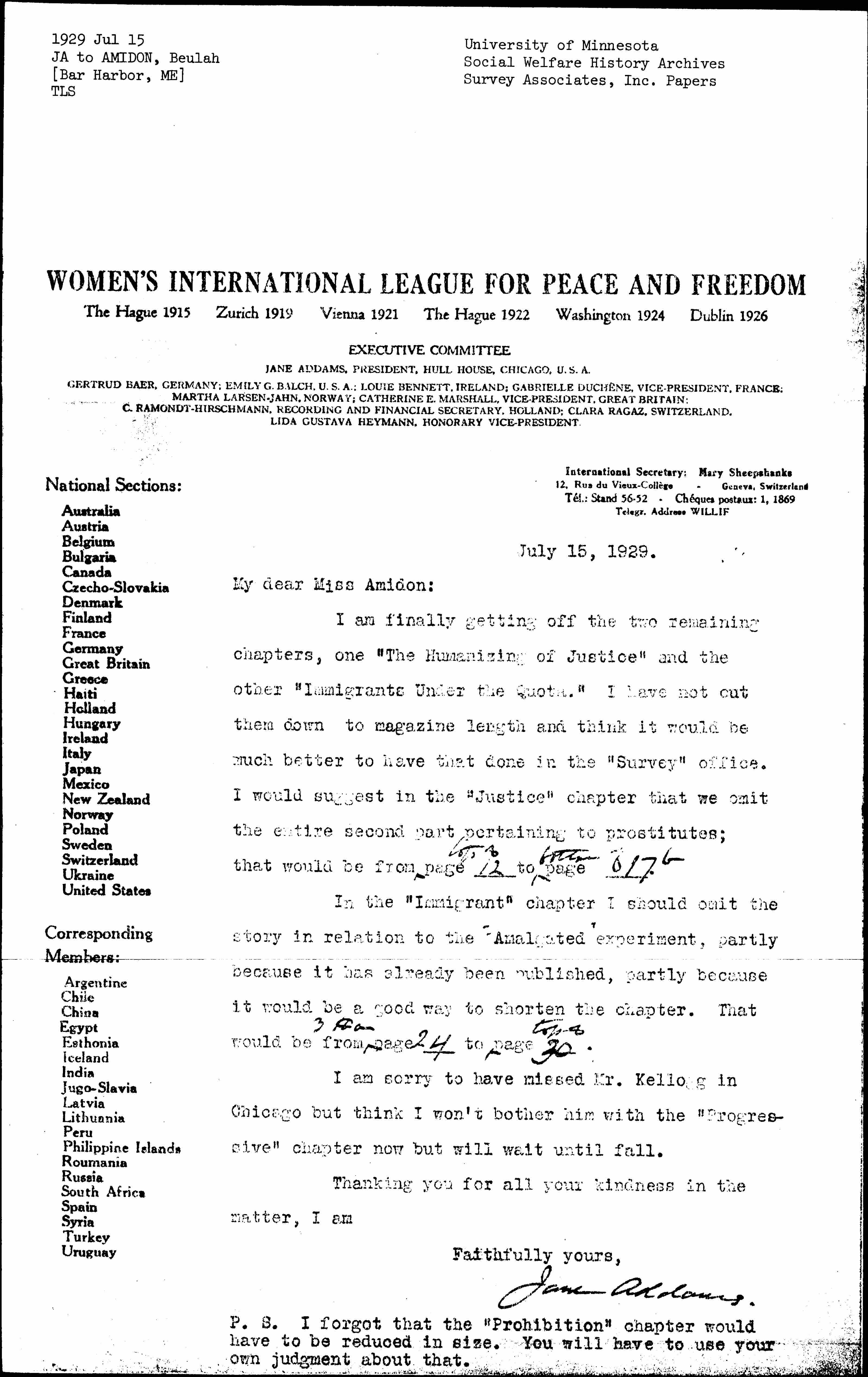 Jane Addams to Beulah Amidon, July 15, 1929
