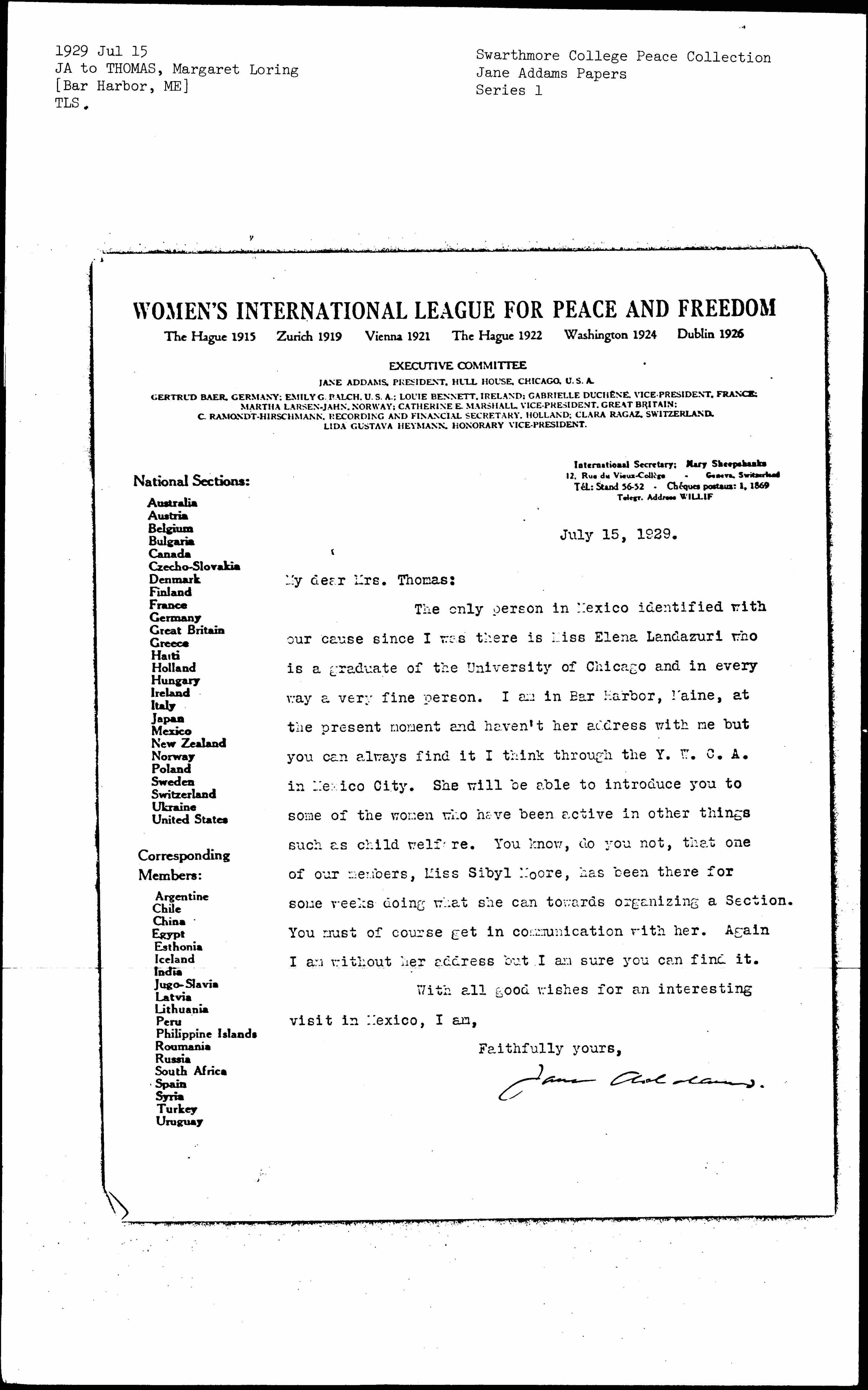 Jane Addams to Margaret Loring Thomas, July 15, 1929