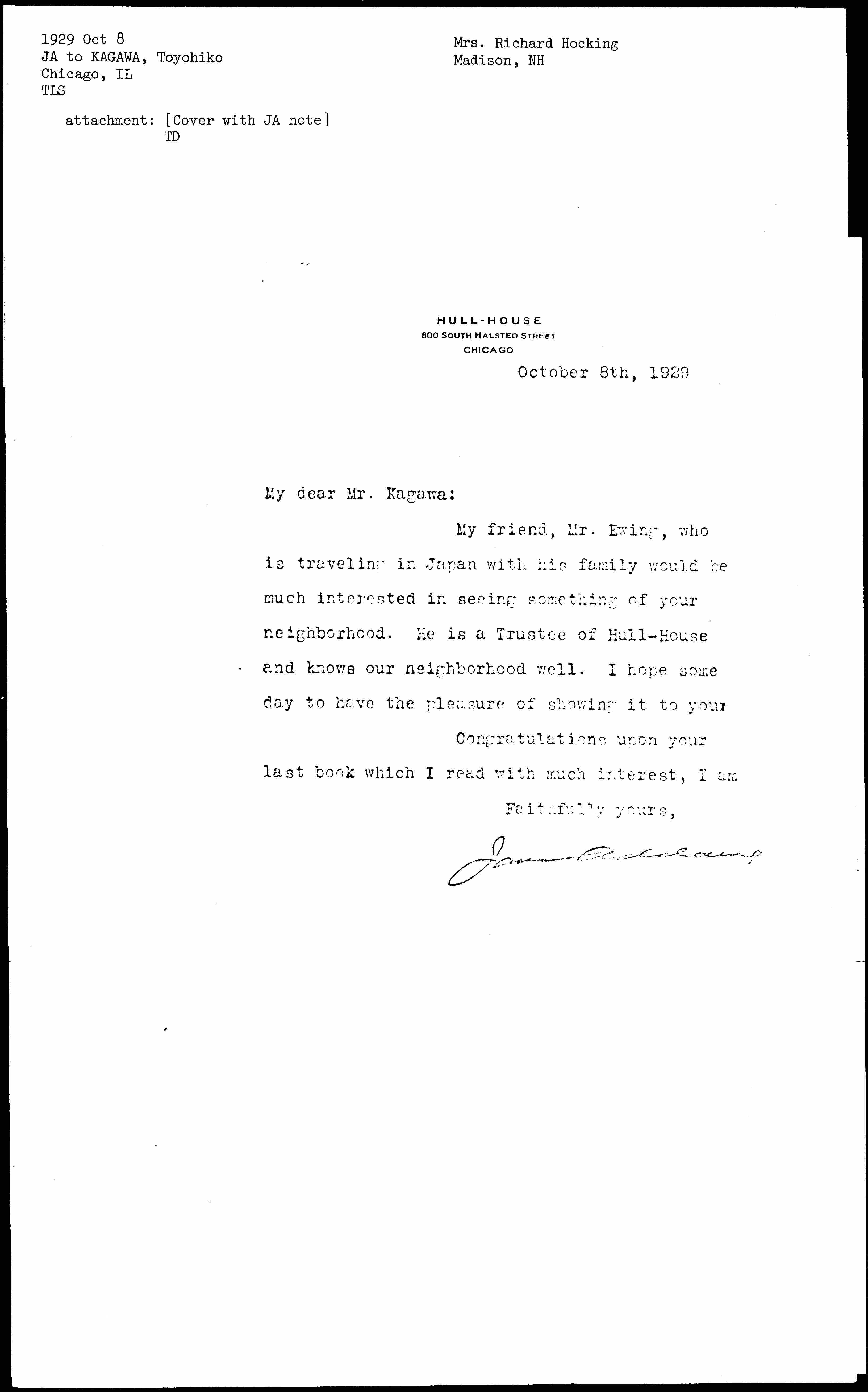 Jane Addams to Toyohiko Kagawa, October 8, 1929