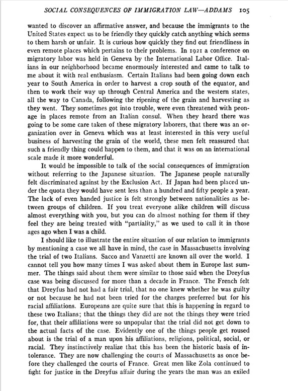 I should like to illustrate the entire situation of our relation to immigrants by mentioning a case we all have in mind, the case in Massachusetts involving the trial of two Italians. Sacco and Vanzetti are known all over the world. I cannot tell you how many times I was asked about them in Europe last summer. The things said about them were similar to those said when the Dreyfus case was being discussed for more than a decade in France. The French felt that Dreyfus had not had a fair trial, that no one knew whether he was guilty or not because he had not been tried for the charges preferred but for his racial affiliations. Europeans are quite sure that this is happening in regard to these two Italians; that the things they did are not the things they were tried for, that their affiliations were so unpopular that the trial did not get down to the actual facts of the case. Evidently one of the things people get roused about is the trial of a man upon his affiliations, religions, political, social, or racial. They instinctively realize that this has been the historic basis of intolerance. They are now challenging the courts of Massachusetts as once before they challenged the courts of France. Great men like Zola continued to fight for justice in the Dreyfus affair during the years the man was an exiled [page 5] prisoner, until the matter was finally righted. It is to the credit of human nature -- such an effort -- and I suspect we are going to see something like this prolonged in the Sacco-Vanzetti case until the matter is gone into with such thoroughness that people shall be relieved of their suspicions. To live in an Italian neighborhood when men of that nationality are suspected of being treated unfairly makes one realize that fair dealing to the immigrants who come to this country is of primary importance. We must be scrupulous in the justice that is dealt out to them, not only what seems just to us but what seems just to them. Perhaps we are having an acid test of American life just now in this trial of two humble Italians in what we used to call one of our most advanced states. People all over the country and from many parts of the world have sent petitions to the governor of Massachusetts asking for a pardon for these men. The pardoning power vested in the executive is an integral part of our system of jurisprudence and a recognized safeguard against the miscarriage of justice.