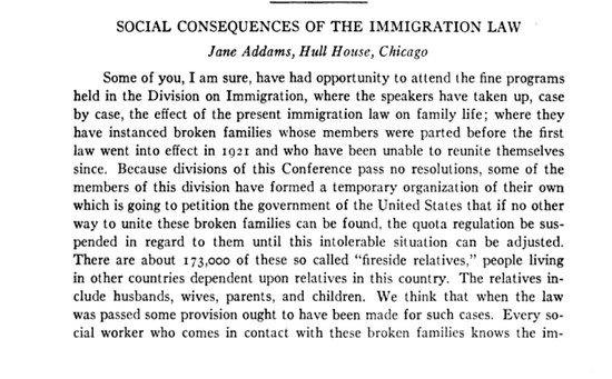 Some of you, I am sure, have had opportunity to attend the fine programs held in the Division on Immigration, where the speakers have taken up, case by case, the effect of the present immigration law on family life; where they have instanced broken families whose members were parted before the first law went into effect in 1921 and who have been unable to reunite themselves since. Because divisions of the Conference pass no resolutions, some of the members of this division have formed a temporary organization of their own which is going to petition the government of the United States that if no other way to unite these broken families can be found, the quota regulation be suspended in regard to them until this intolerable situation can be adjusted. There are about 173,000 of these so called "fireside relatives," people living in other countries dependent upon relatives in this country. The relatives include husbands, wives, parents, and children. We think that when the law was passed some provision ought to have been made for such cases. Every social worker who comes in contact with these broken families knows the importance [page 2] of doing something to reunite them. Many of them had been separated before the war, could do nothing during the years of broken down transportation, and before normal conditions were restored were placed under the operation of the quota law without warning. One man who found himself in this situation and could do nothing to adjust his affairs said, doubtless under great provocation, that the United States bythis law was encouraging bigamy.