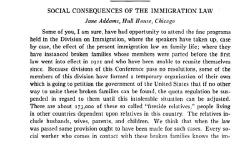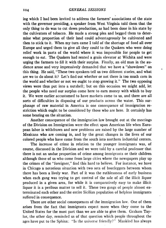 There are other social consequences of the immigration law. One of them arises from the fact that immigrants expect more when they come to the United States for the most part than we are able to give them. Graham Taylor, the other day, reminded us of that question which people throughout the ages have put to the Sphinx: "Is the universe friendly?" Mankind has always [page 4] wanted to discover an affirmative answer, and because the immigrants to the United States expect us to be friendly they quickly catch anything which seems to them harsh or unfair. It is curious how quickly they find out friendliness in even remote places which pertains to their problems. In 1921 a conference on migratory labor was held in Geneva by the International Labor Office. Italians in our neighborhood became enormously interested and came to talk to me about it with real enthusiasm. Certain Italians had been going down each year to South America in order to harvest a crop south of the equator, and then to work their way up through Central America and the western states, all the way to Canada, following the ripening of the grain and harvesting as they went. They sometimes got into trouble, were even threatened with peonage in places remote from an Italian consul. When they heard there was going to be some care taken of these migratory laborers, that there was an organization over in Geneva which was at least interested in this very useful business of harvesting the grain of the world, these men felt reassured that such a friendly thing could happen to them, and that it was on an international scale made it more wonderful.