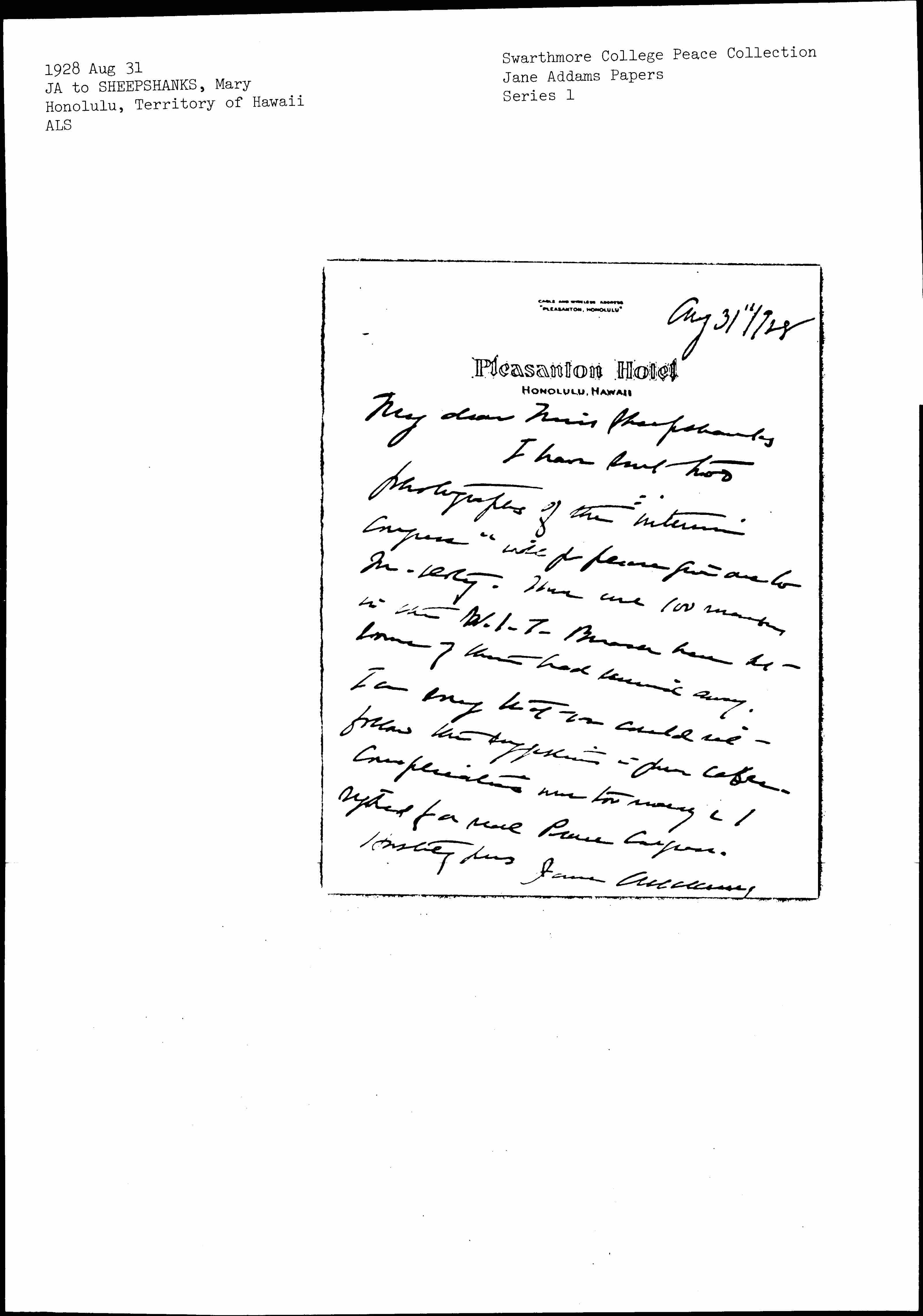 Jane Addams to Mary Ryott Sheepshanks, August 31, 1928