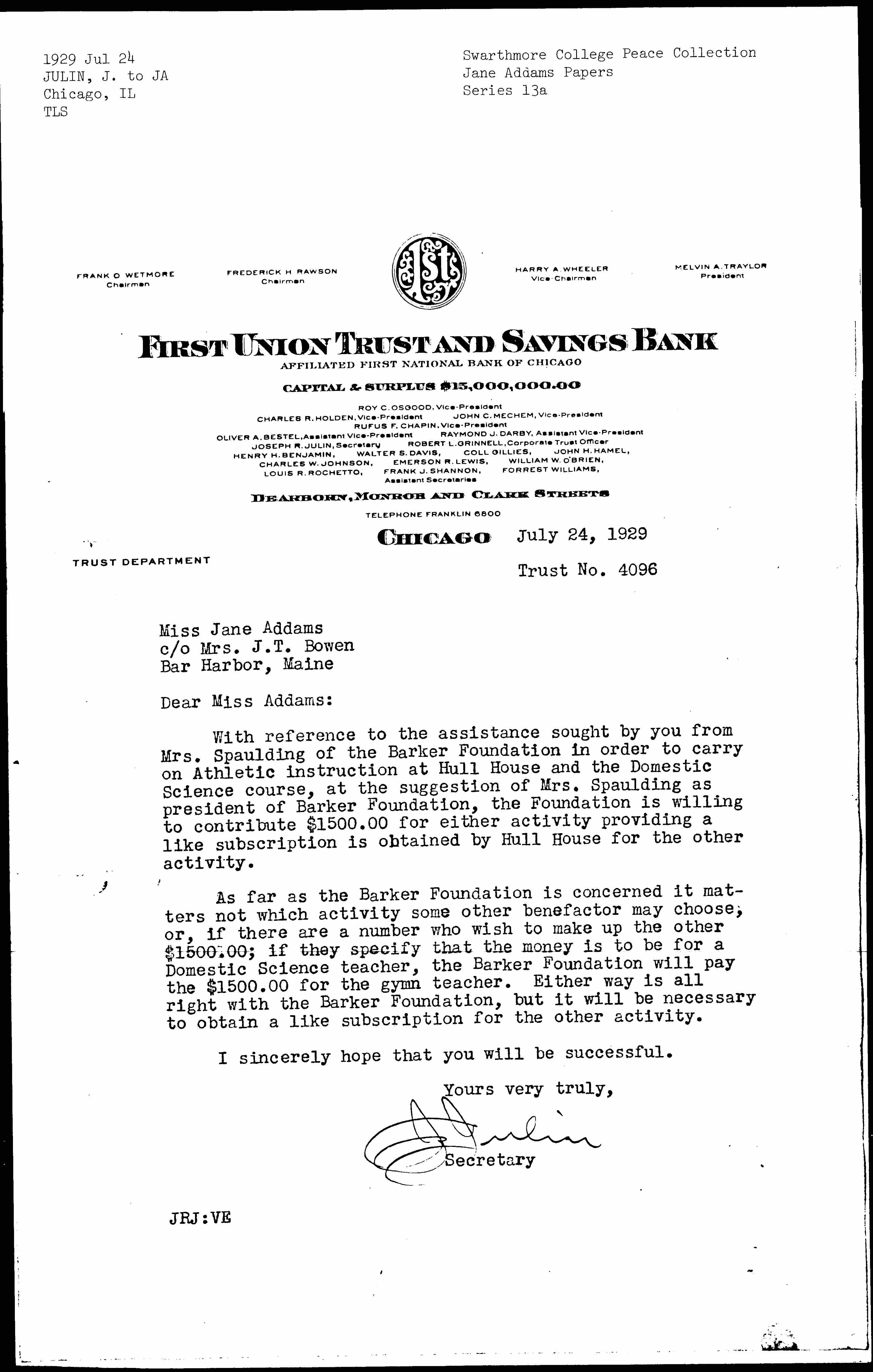 Joseph Rudolph Julin to Jane Addams, July 24, 1929