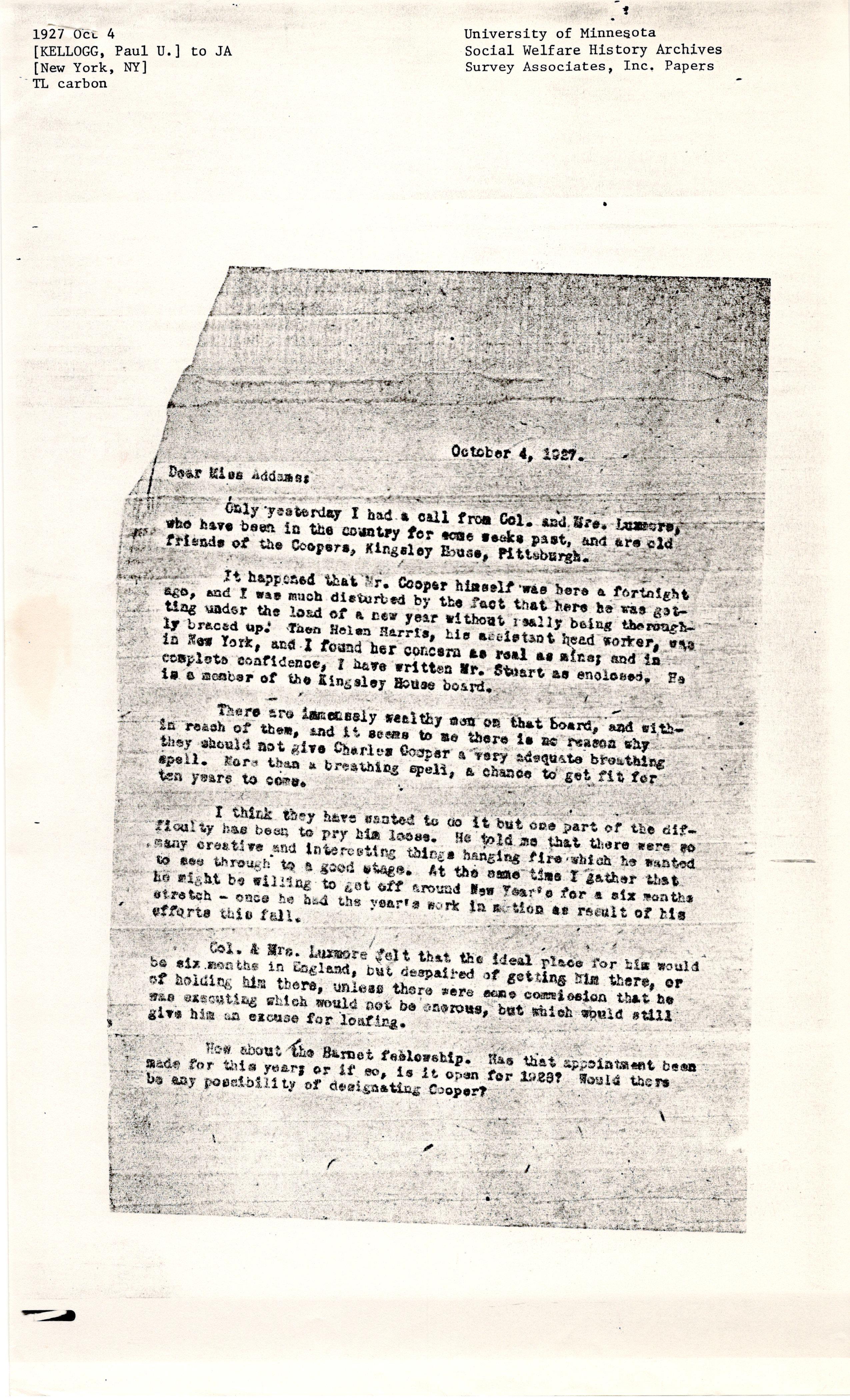 It happened that Mr. Cooper himself was here a fortnight ago, and I was much disturbed by the fact that here he was getting under the load of a new year without really being thoroughly braced up. Then Helen Harris, his assistant head worker, was in New York, and I found her concern as real as mine; and in complete confidence, I have written Mr. Stuart as enclosed. He is a member of the Kingsley House board.