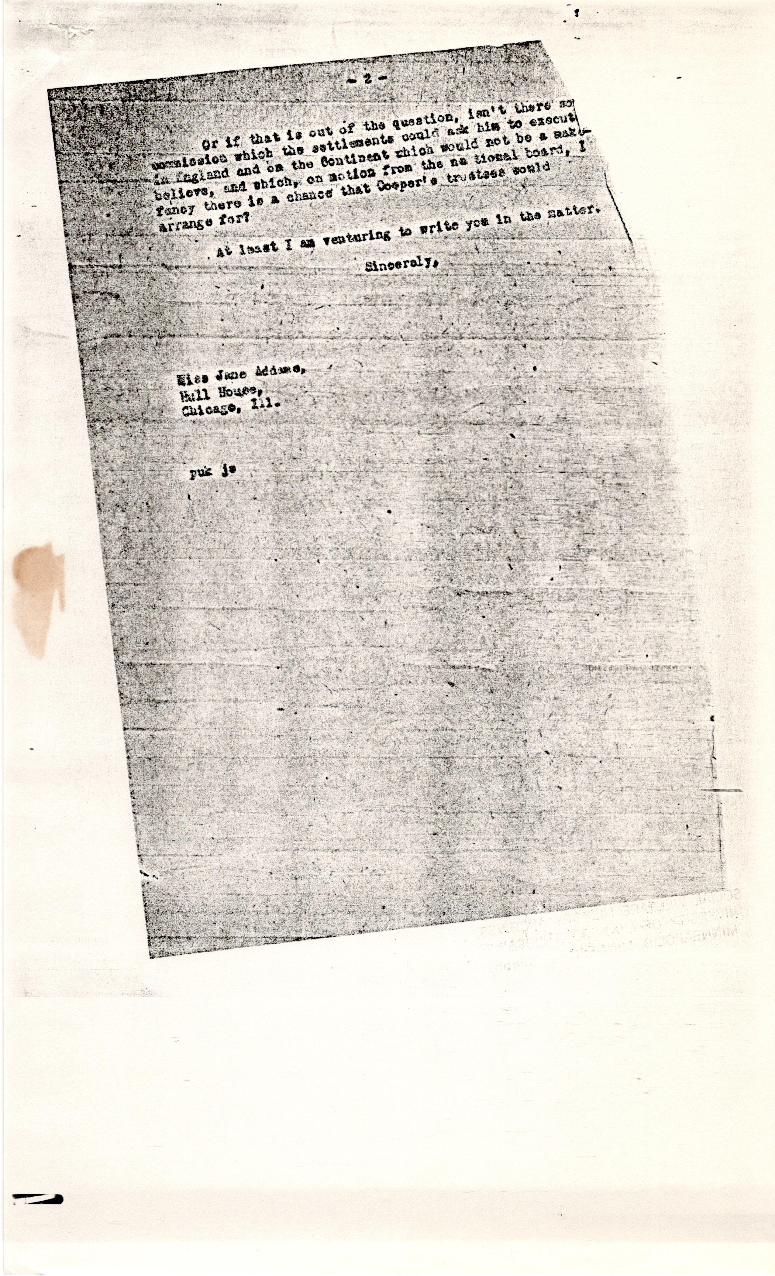 Or if that is out of the question, isn't there [some] commission which the settlements could ask him to [execute] in England and on the Continent which would not be a make-believe, and which, on motion from the national board, I fancy there is a chance that Cooper's trustees would arrange for?