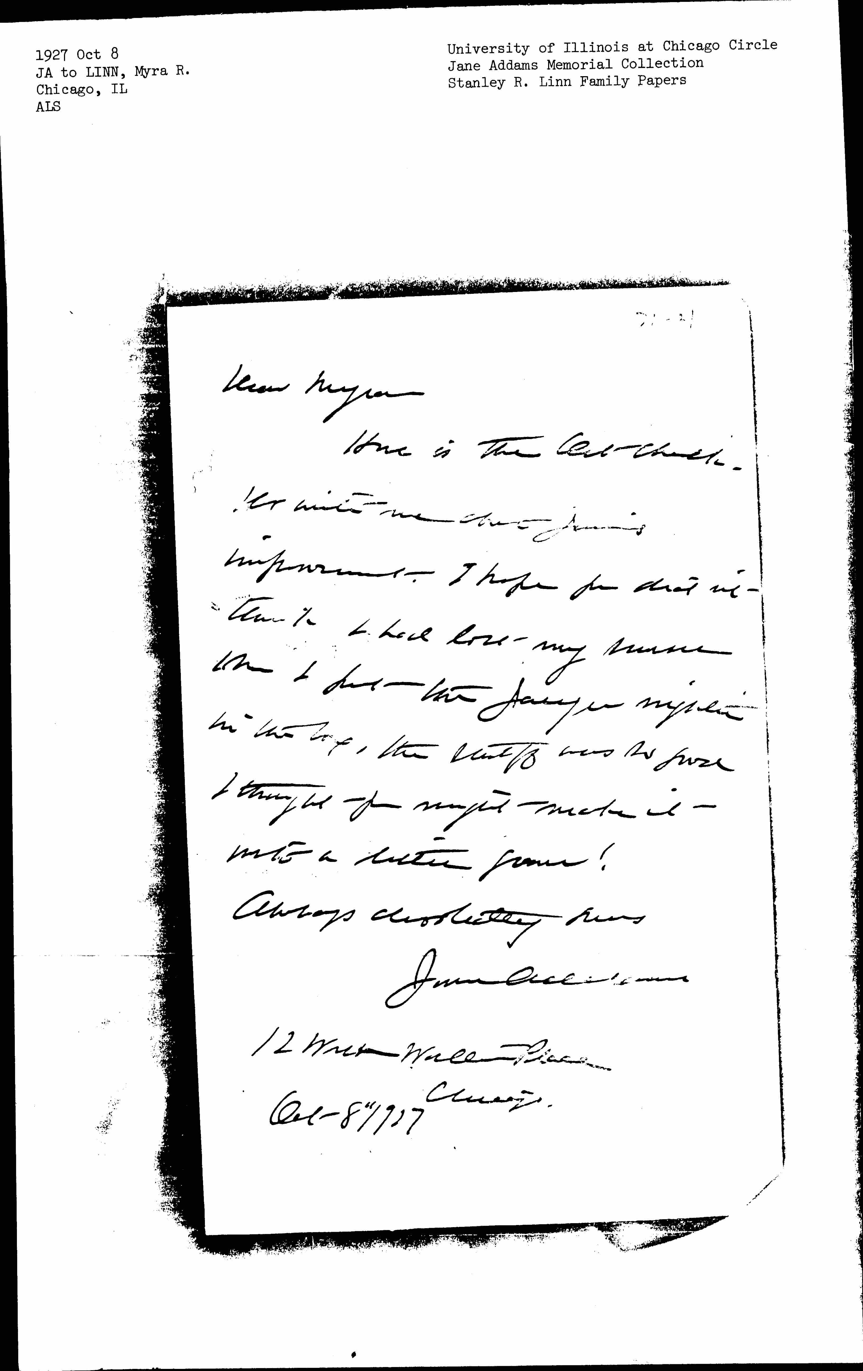 Jane Addams to Myra Harriet Reynolds Linn, October 8, 1927