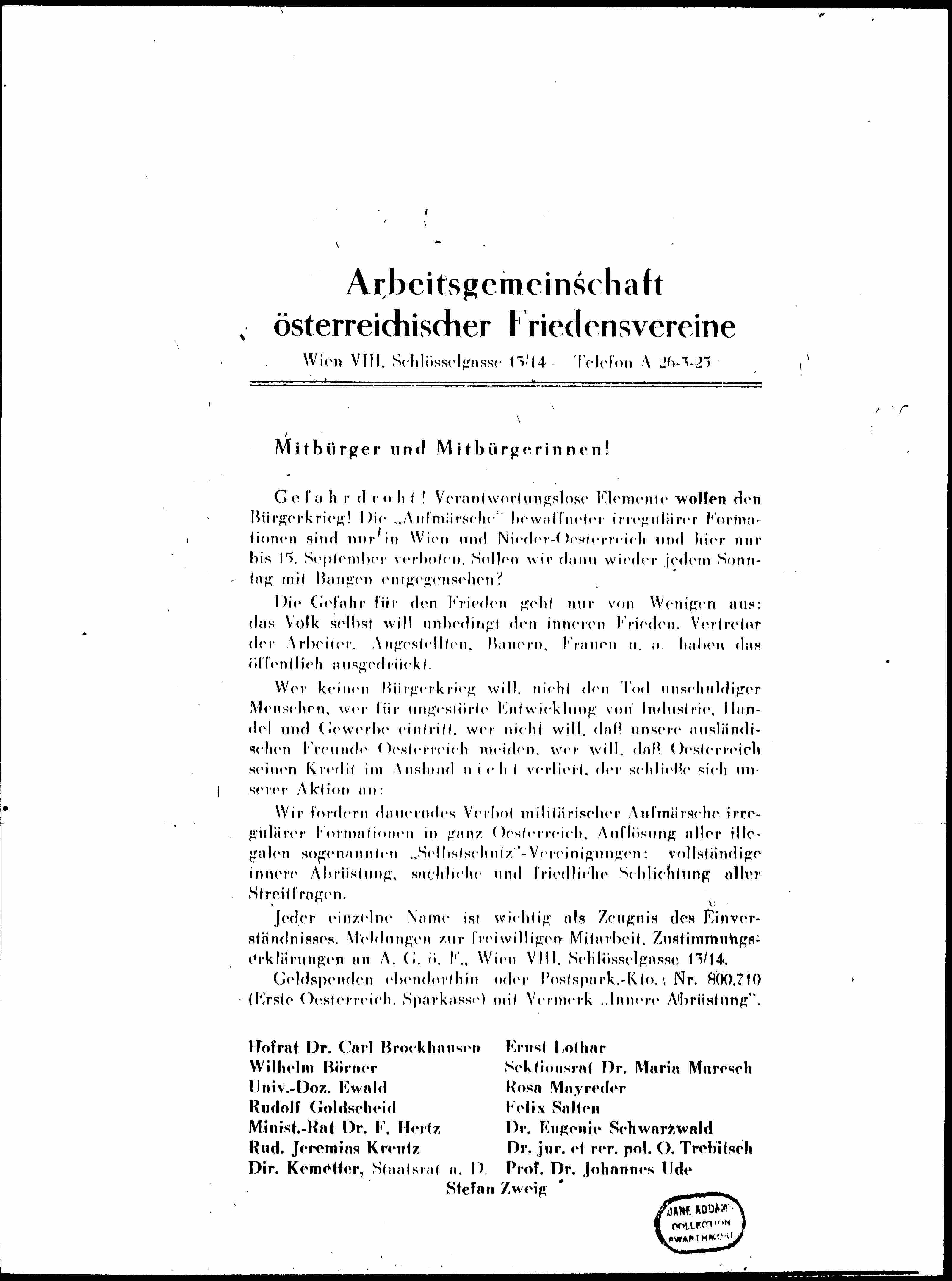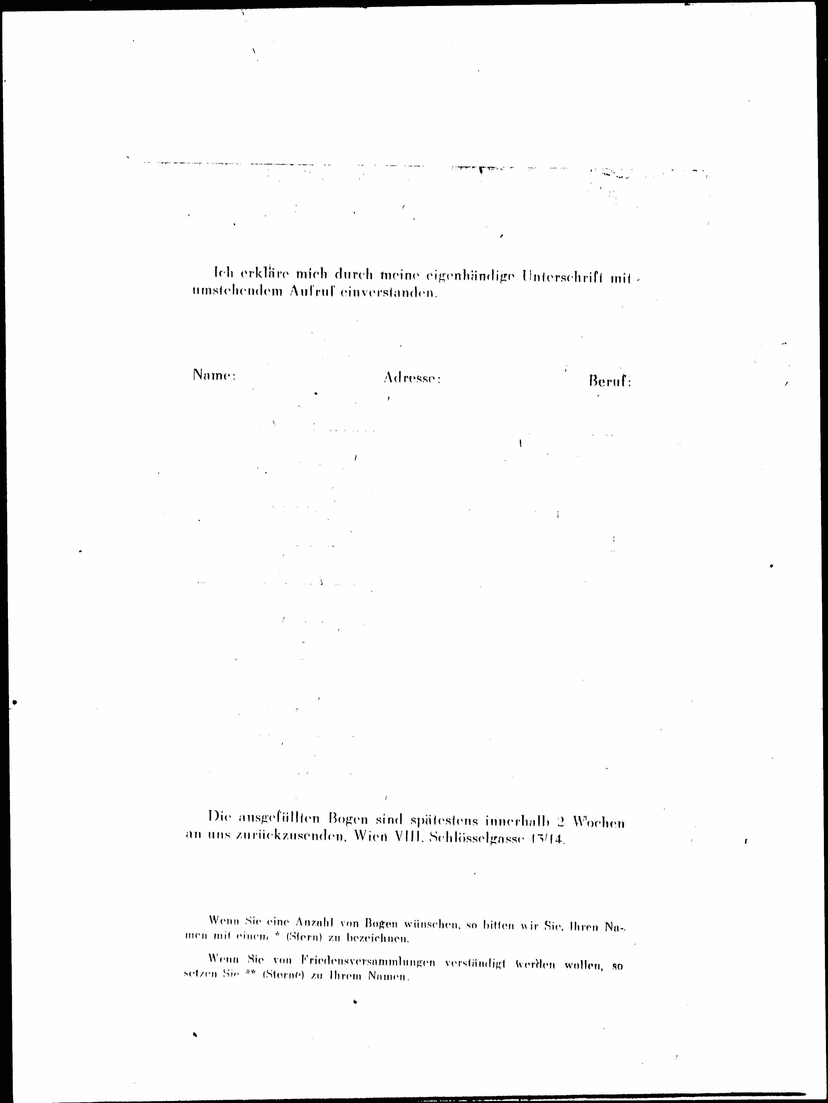 Every single name is important as a testimony of agreement. Reports for voluntary cooperation and declarations of consent should be sent to: A. G. ö. F., Wien VIII, Schlösselgasse 13/14.