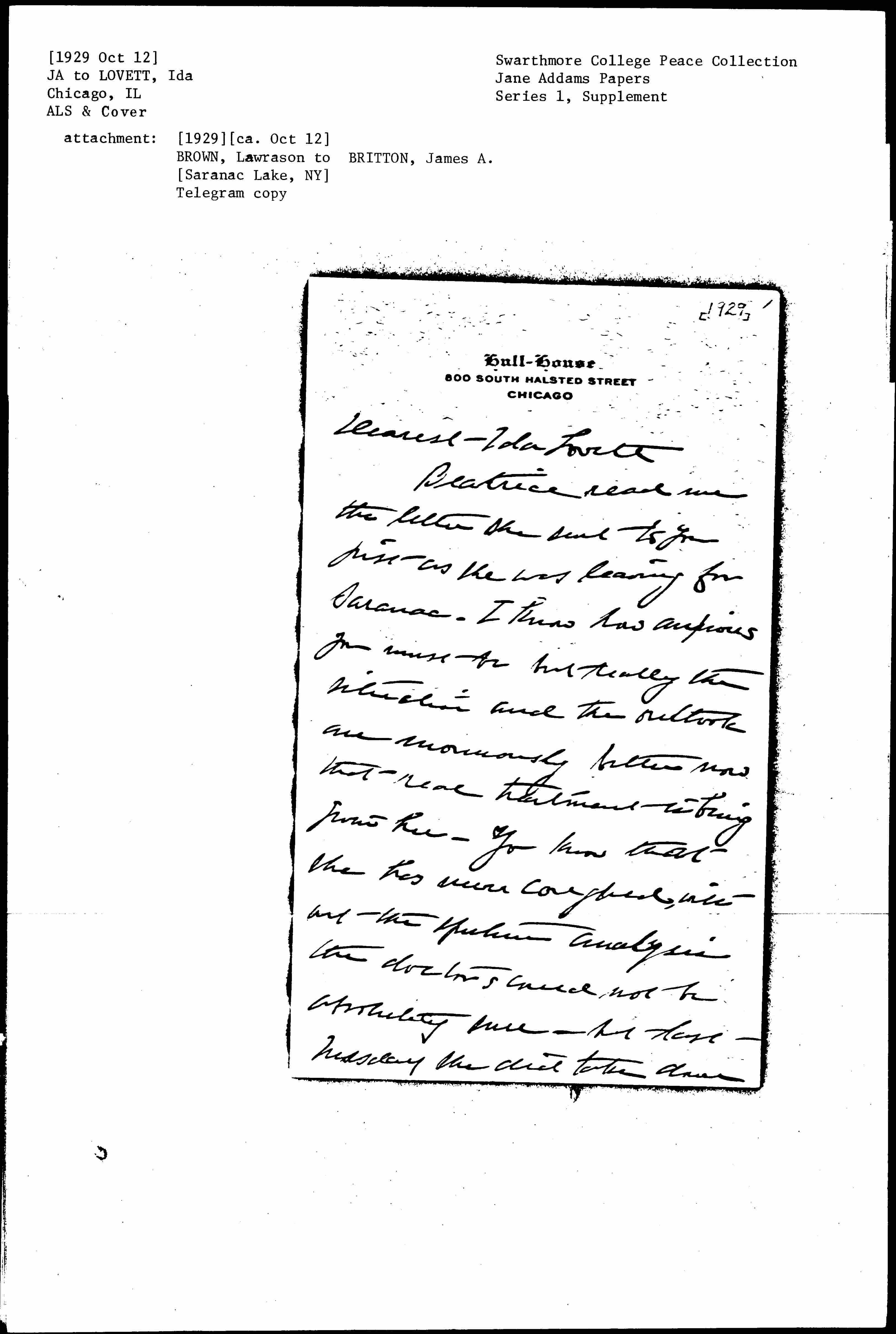 Jane Addams to Ida Campbell Mott-Smith Lovett, October 12, 1929