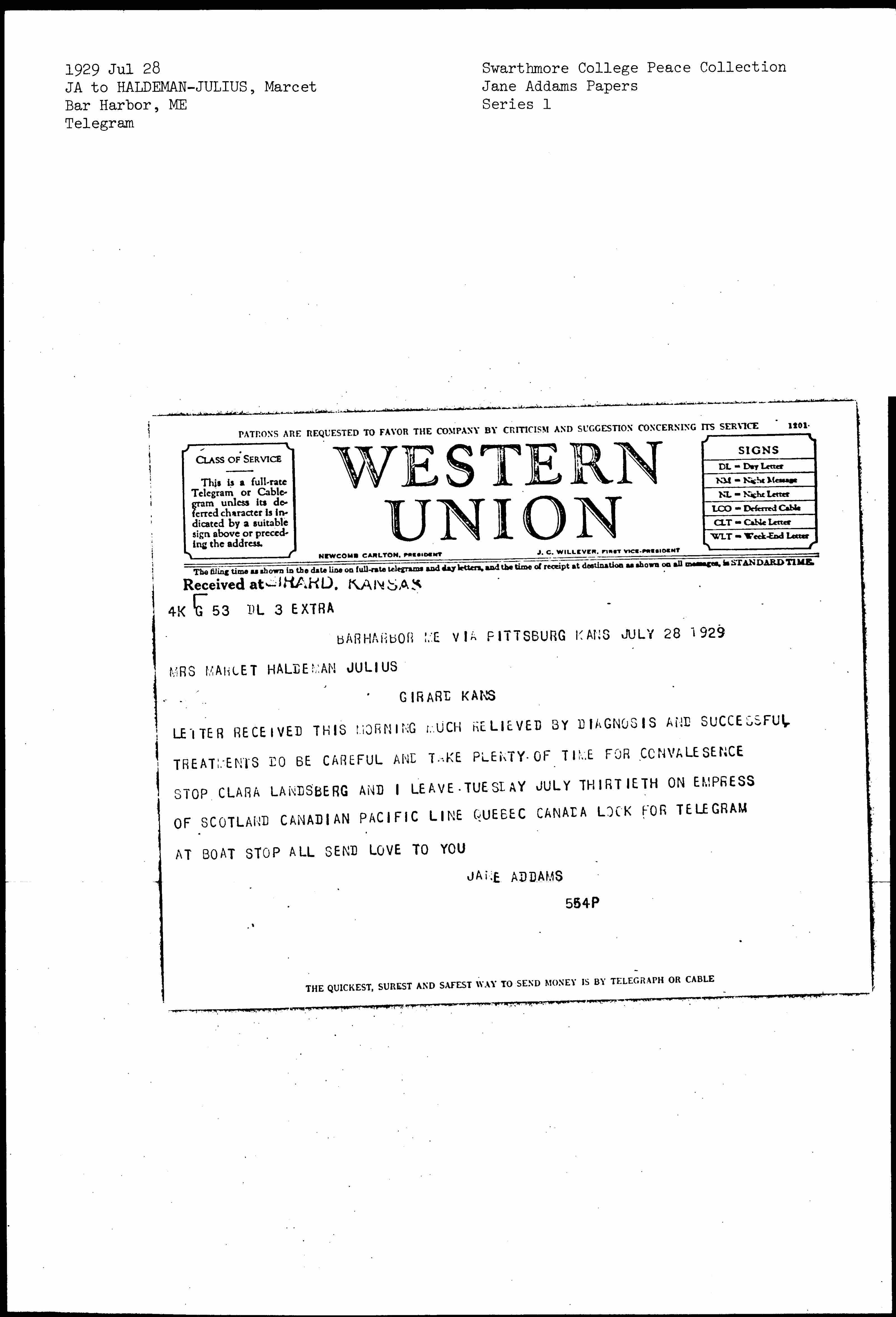 Jane Addams to Anna Marcet Haldeman-Julius, July 28, 1929