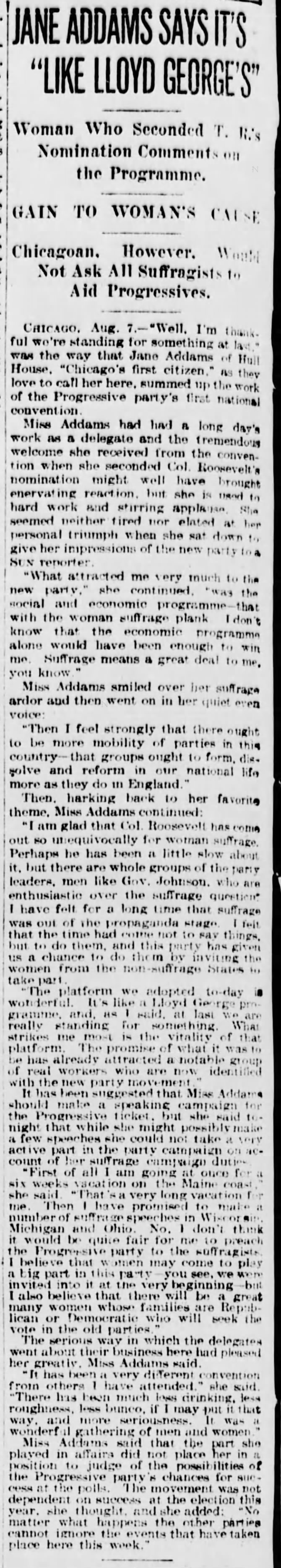 "First of all I am going at once for a six weeks vacation on the Maine coast," she said. "That's a very long vacation for me. Then I have promised to make a number of suffrage speeches in Wisconsin, Michigan and Ohio. No, I don't think it would be quite fair for me to preach the Progressive Party to the suffragists. I believe that women may come to play a big part in this party -- you see, we were invited into it at the very beginning -- but I also believe that there will be a great many women whose families are Republican or Democratic who will seek the vote in the old parties."