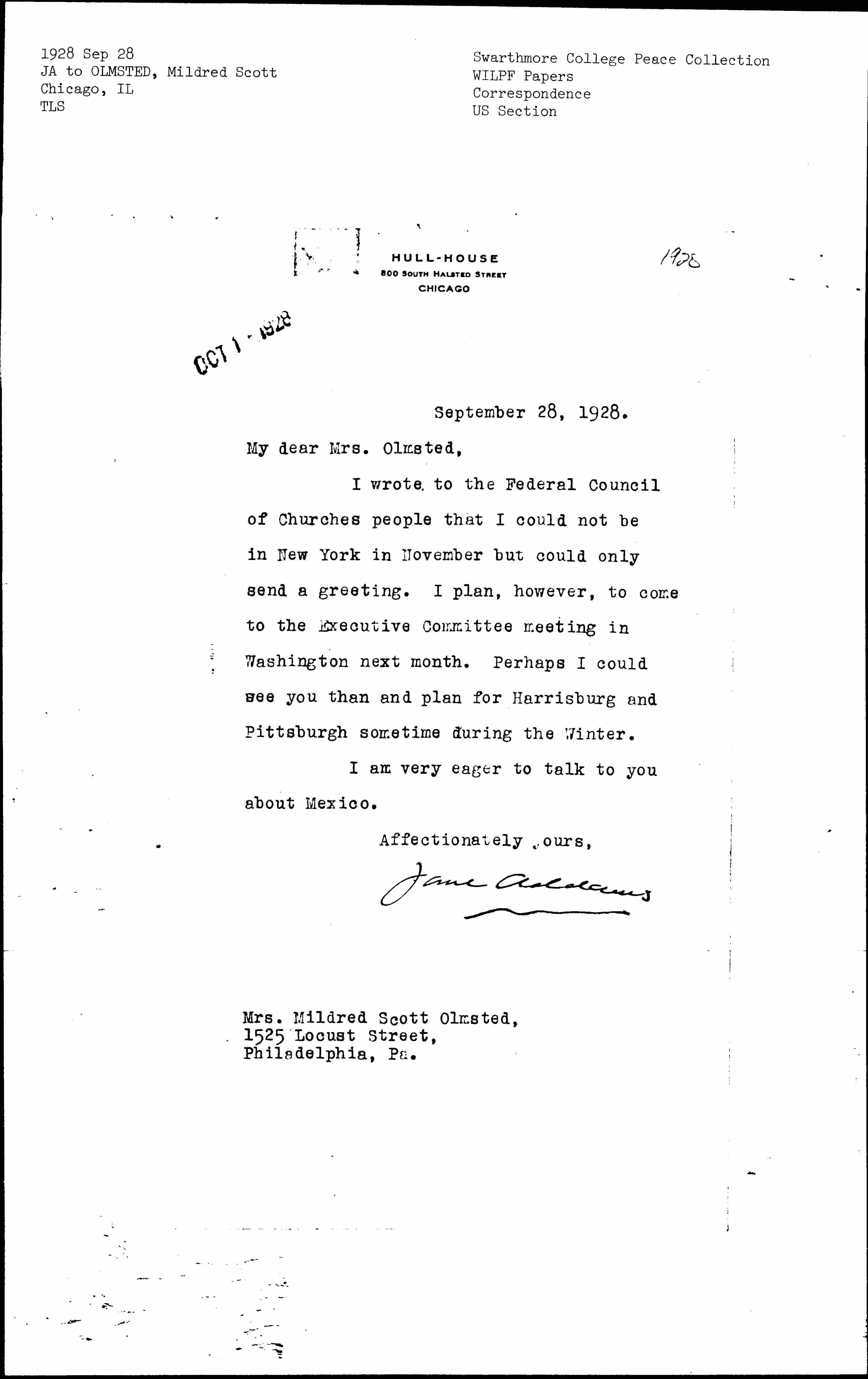 Jane Addams to Mildred Scott Olmsted, September 28, 1928