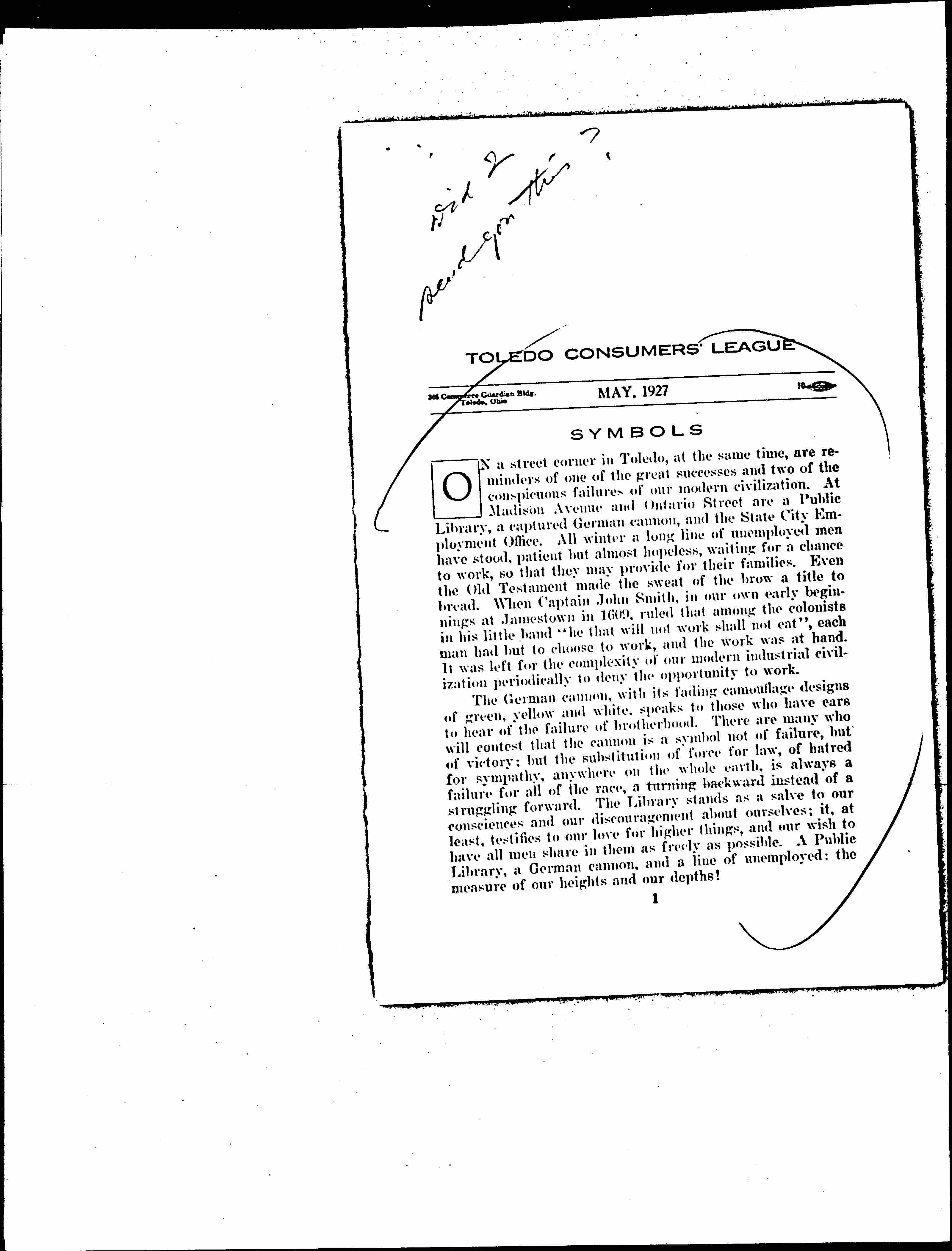 On a street corner in Toledo, at the same time, are reminders of one of the great successes and two of the conspicuous failures of our modern civilization. At Madison Avenue and Ontario Street are a Public Library, a captured German cannon, and the State City Employment Office. All winter a long line of unemployed men have stood, patient but almost hopeless, waiting for a chance to work, so that they may provide for their families. Even the Old Testament made the sweat of the brow a title to bread. When Captain John Smith, in our own early beginnings at Jamestown in 1609, ruled that among the colonists in his little band "he that will not work shall not eat," each man had but to choose to work, and the work was at hand. It was left for the complexity of our modern industrial civilization periodically to deny the opportunity to work.
