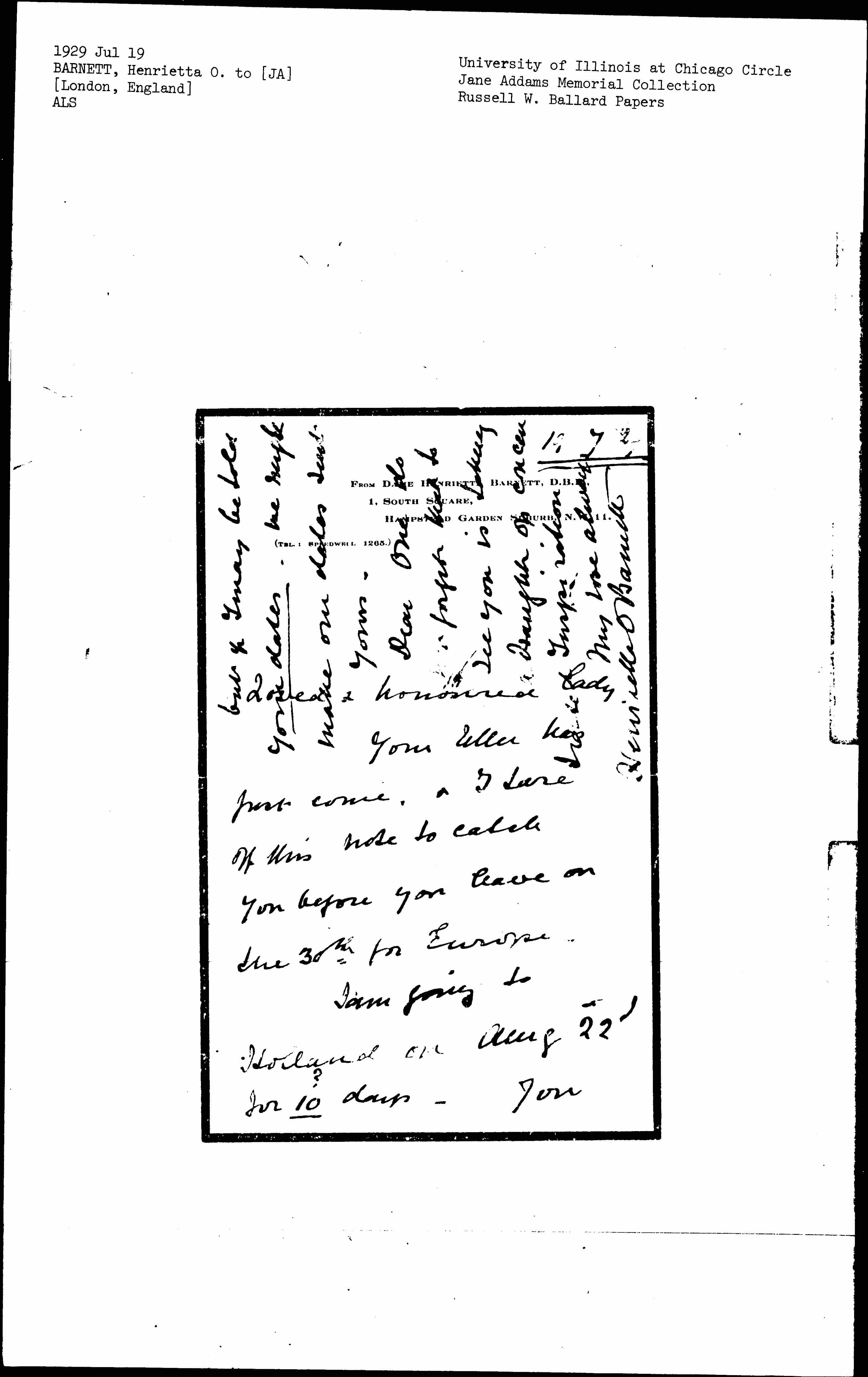 Henrietta Octavia Rowland Barnett to Jane Addams, July 19, 1929