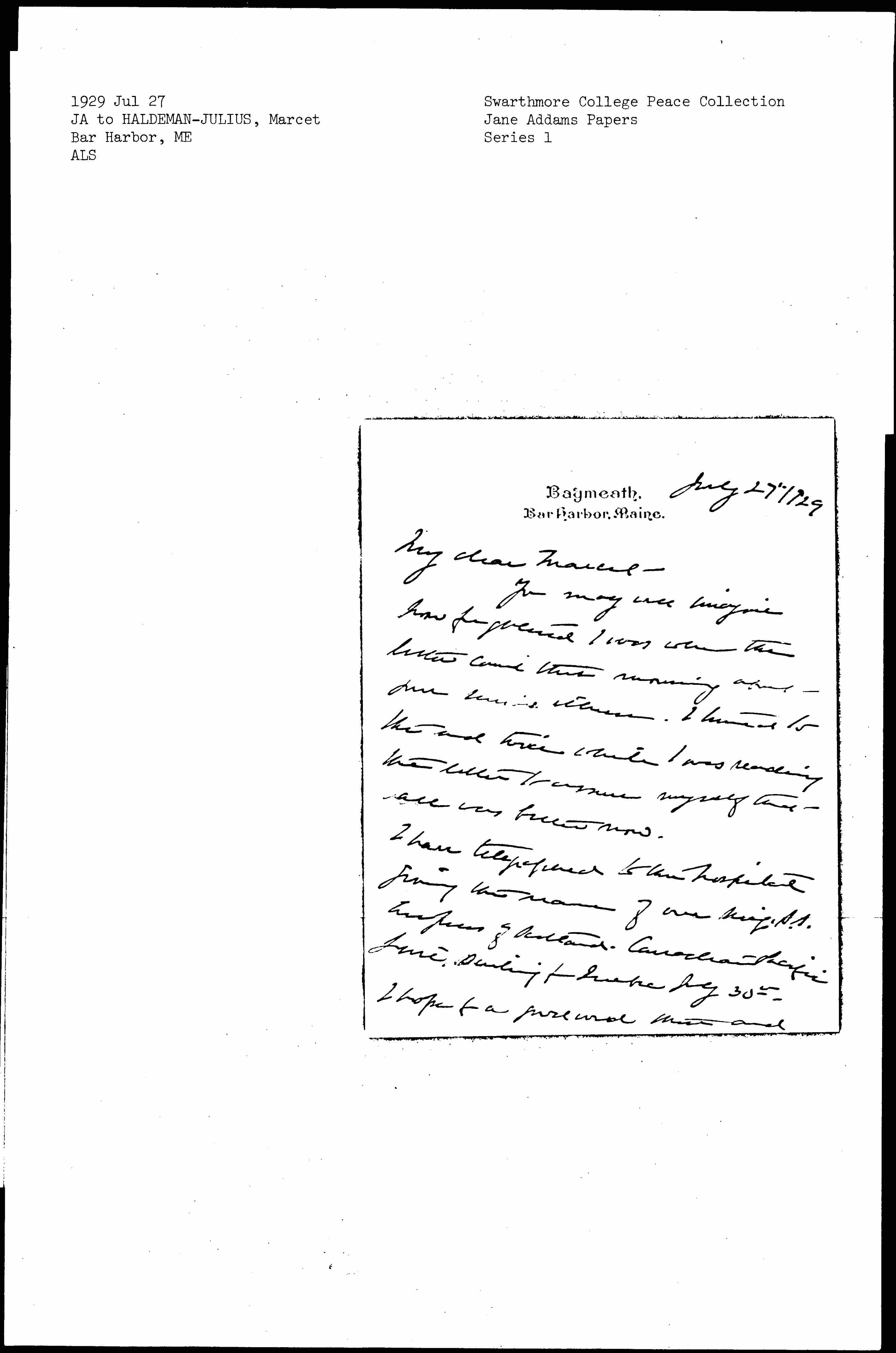 Jane Addams to Anna Marcet Haldeman-Julius, July 27, 1929