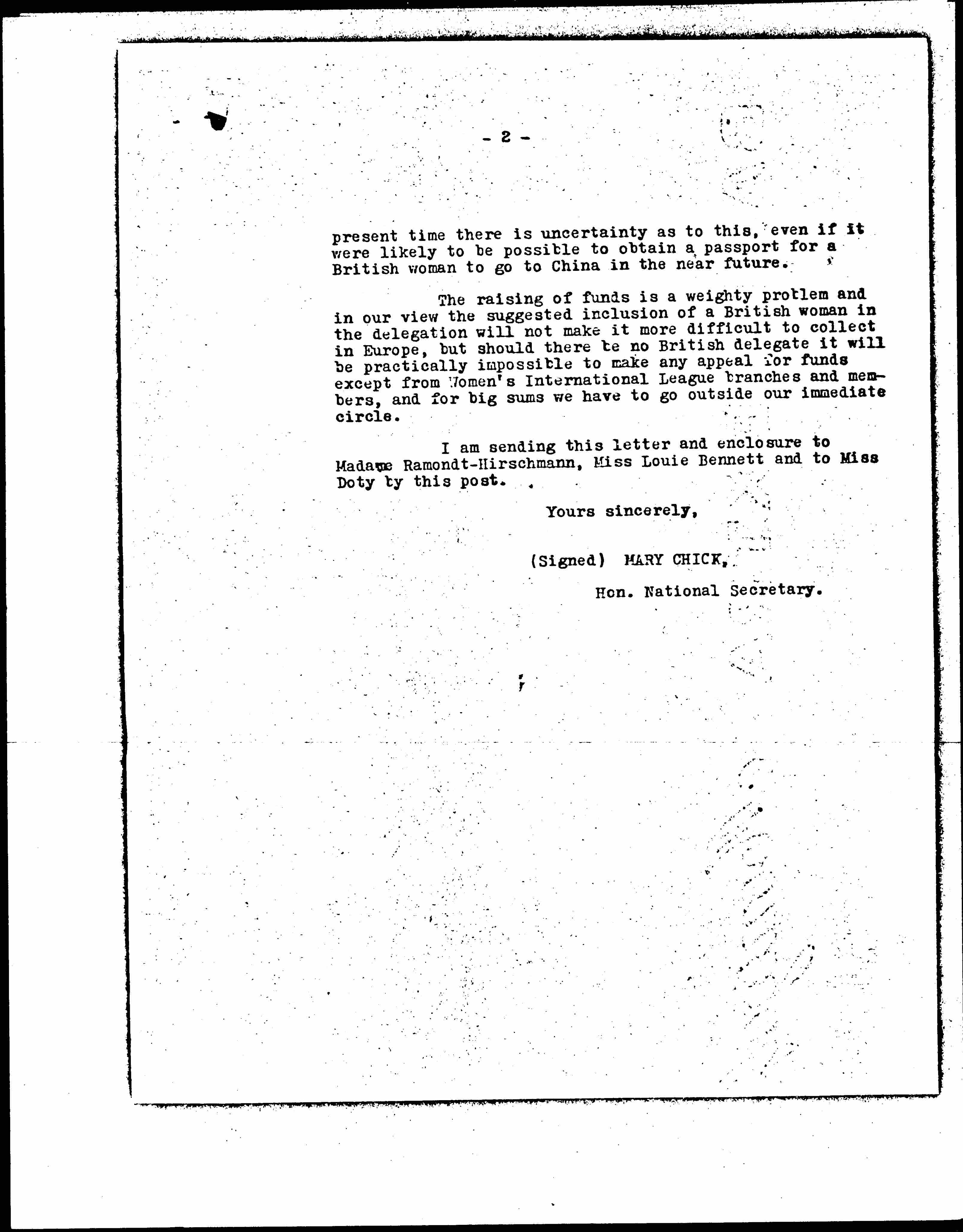 Possibly the fact that only extracts were sent has given rise to misapprehension. I am, therefore, sending you a full copy of this letter from which you will see that all our suggestions in regard to the inclusion of a British delegate to China are in the form of recommendations. We have taken no action in the matter except to think of the best and most suitable women -- if it is decided that a British delegate be included -- and Miss Edith Pye seemed to us to be most suitable if she were available. At the [page 2] present time there is uncertainty as to this, even if it were likely to be possible to obtain a passport for a British woman to go to China in the near future.