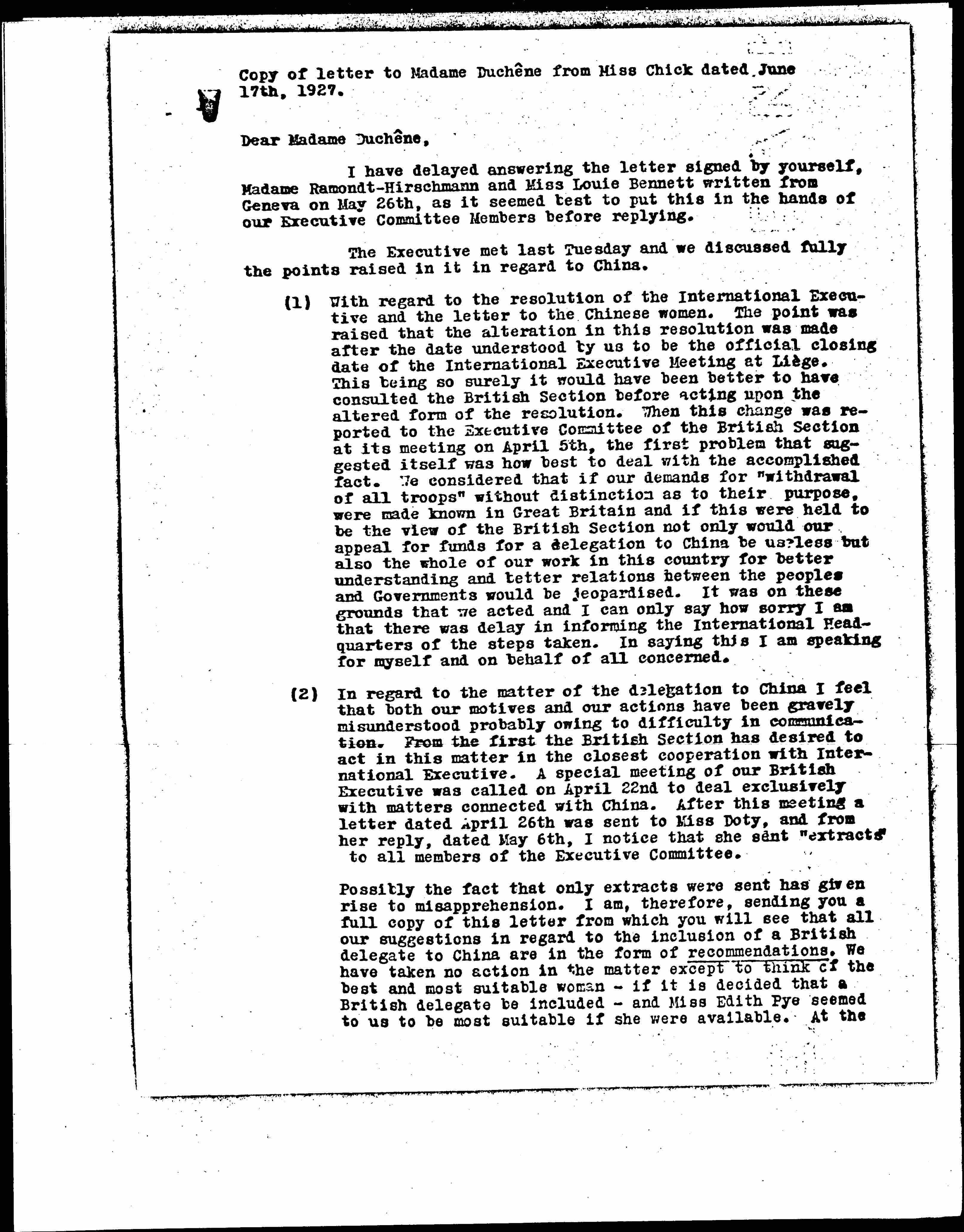 (1) With regard to the resolution of the International Executive and the letter to the Chinese women. The point was raised that the alteration in this resolution was made after the date understood by us to be the official closing date of the International Executive Meeting at Liège. This being so surely it would have been better to have consulted the British Section before acting upon the altered form of the resolution. When this change was reported to the Executive Committee of the British Section at its meeting on April 5th, the first problem that suggested itself was how best to deal with the accomplished fact. We considered that if our demands for "withdrawal of all troops" without distinction as to their purpose, were made known in Great Britain and if this were held to be the view of the British Section not only would our appeal for funds for a delegation to China be useless but also the whole of our work in this country for better understanding and better relations between the peoples and Governments would be [jeopardized]. It was on these grounds that we acted and I can only say how sorry I am that there was delay in informing the International Headquarters of the steps taken. In saying this I am speaking for myself and on behalf of all concerned.