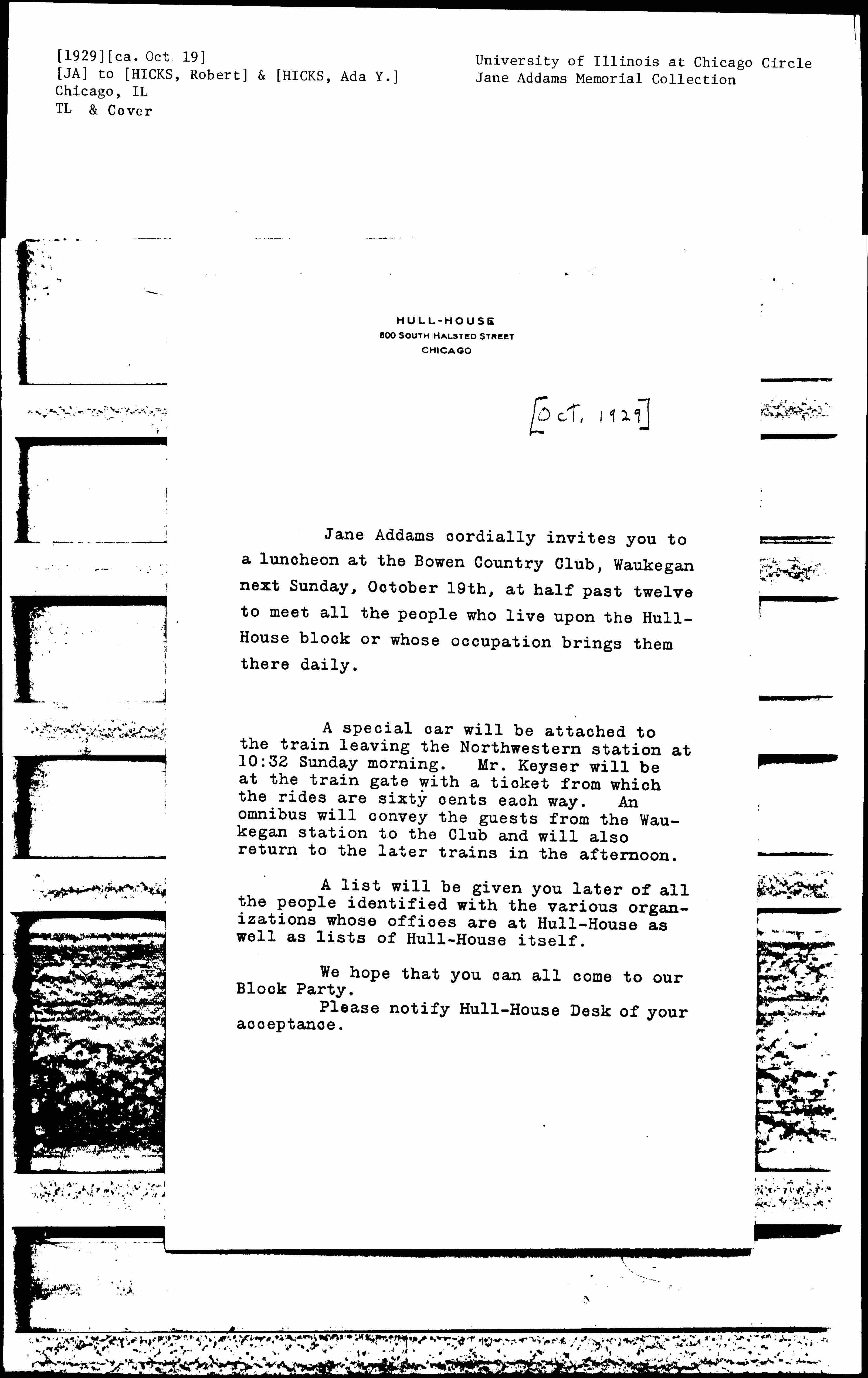 Invitation to Hull-House Block Party at the Bowen Country Club, October19, 1929