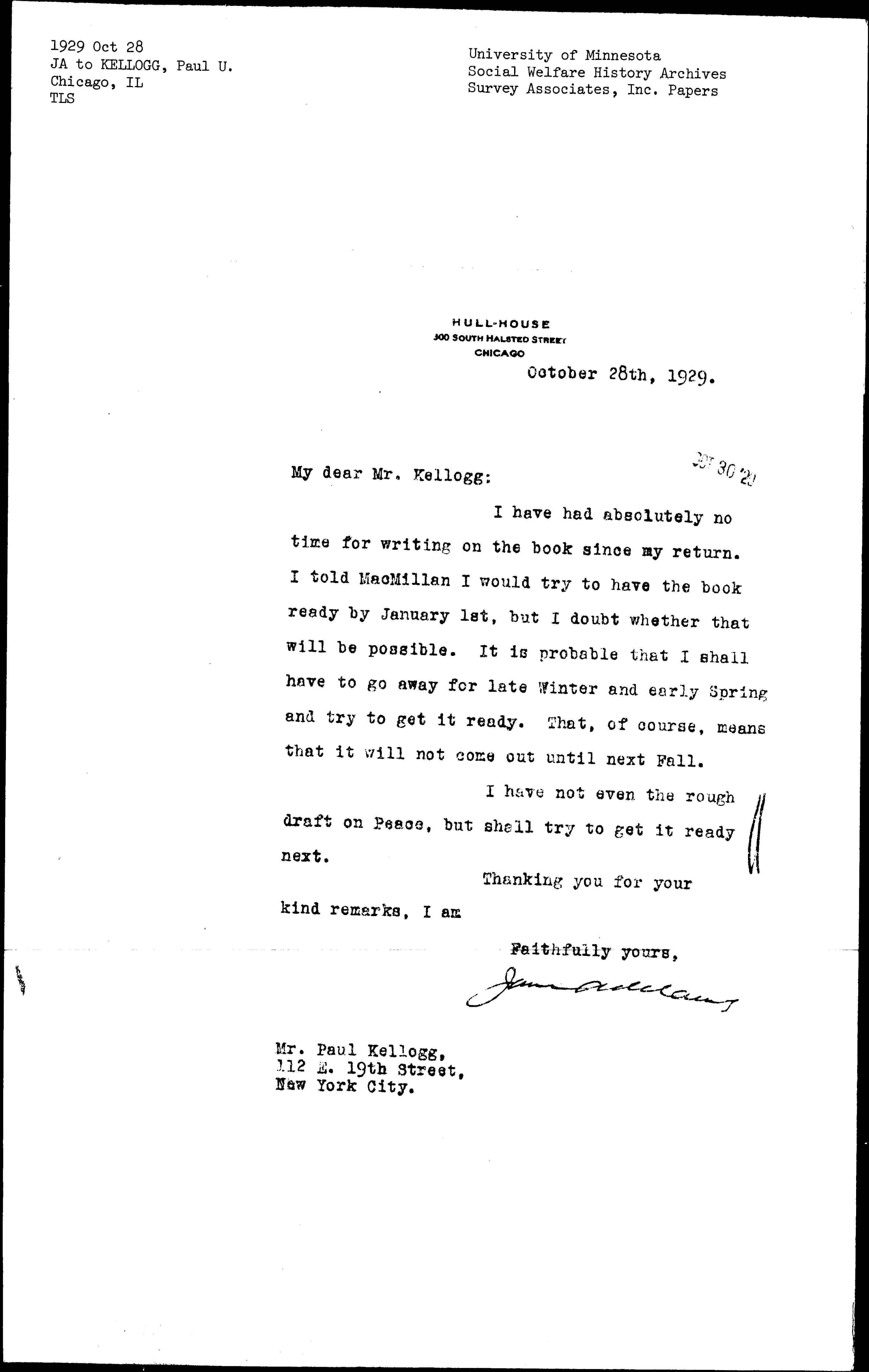 Jane Addams to Paul Underwood Kellogg, October 28, 1929