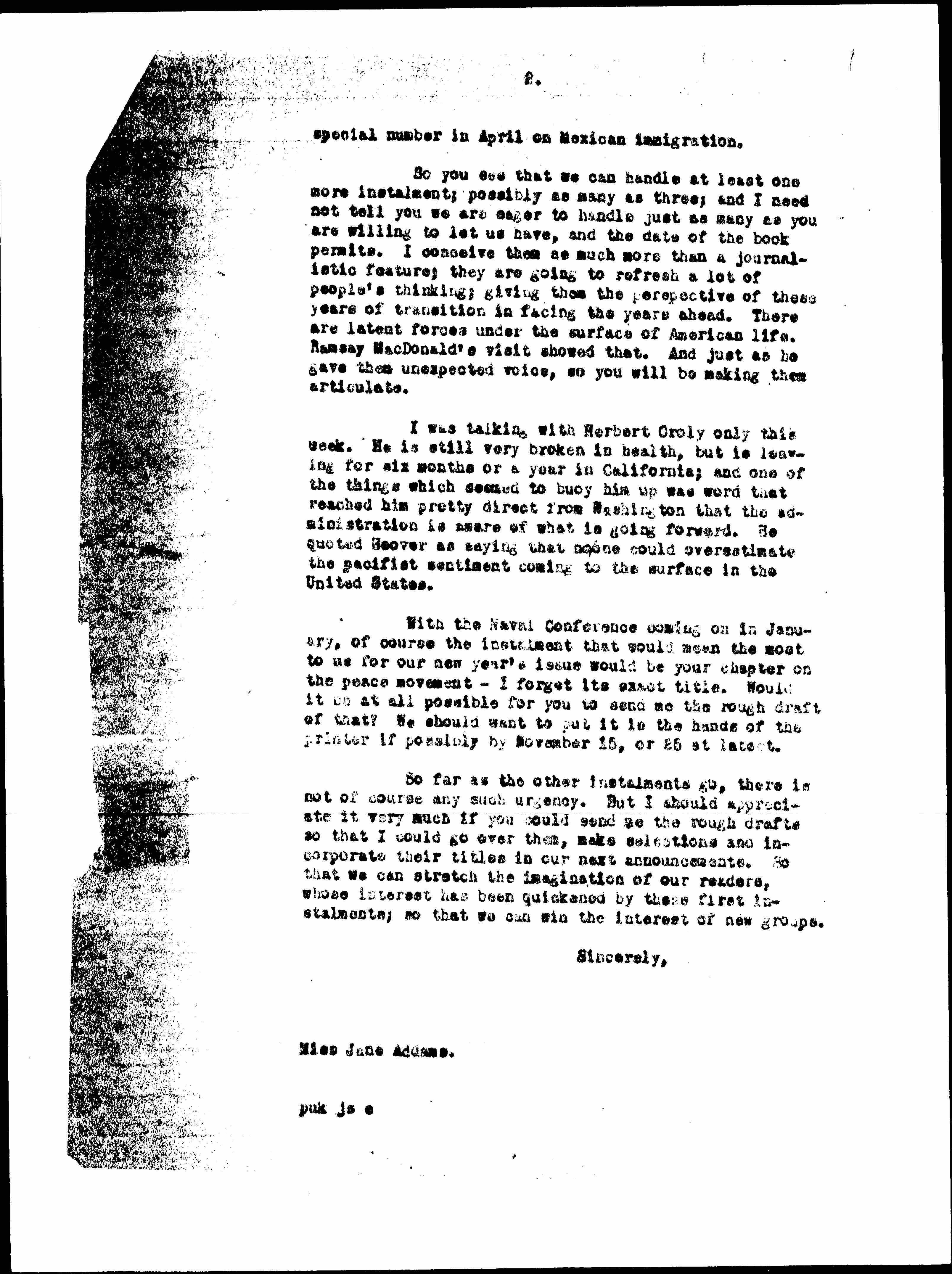 Jane Addams to Paul Underwood Kellogg, October 28, 1929