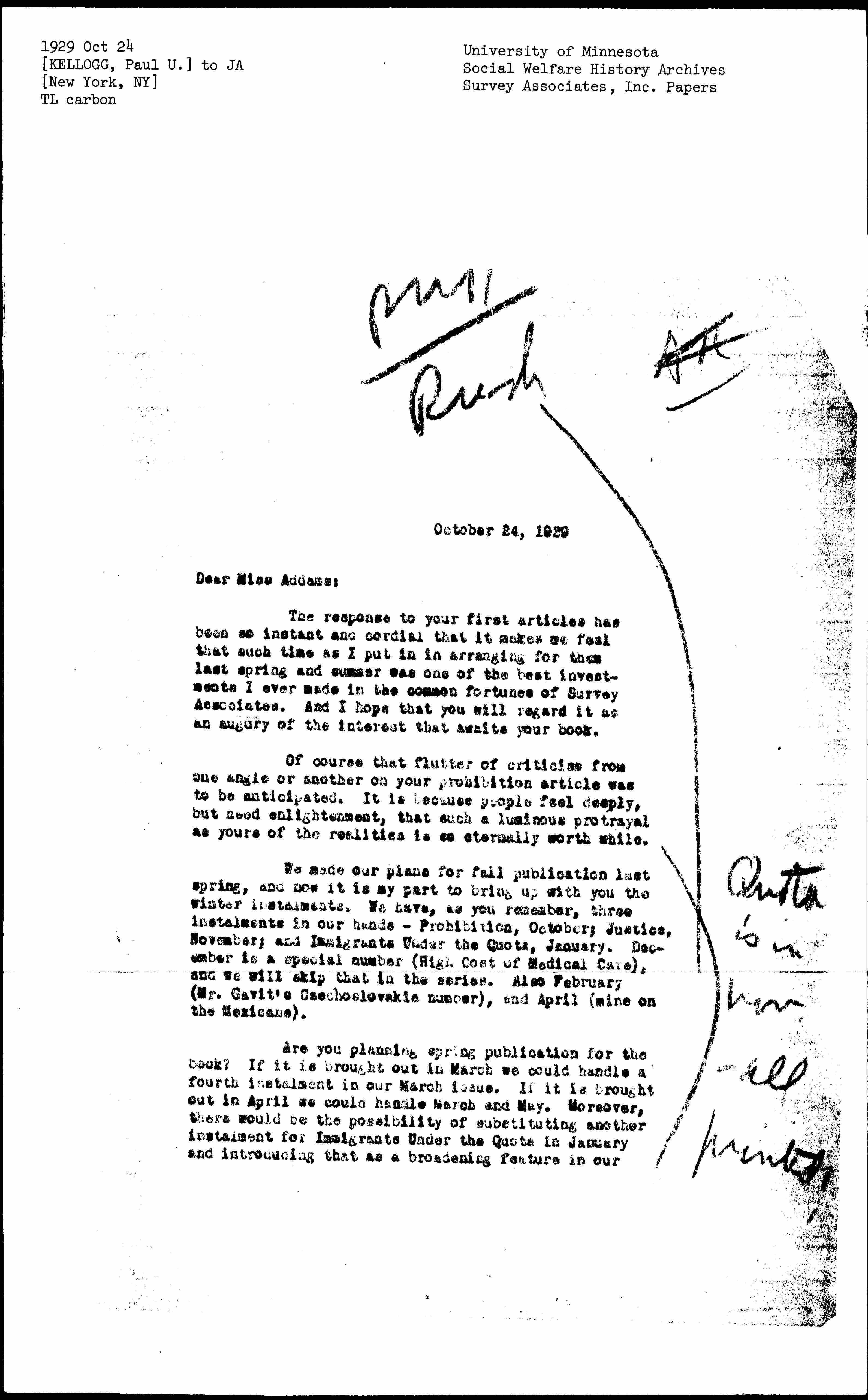 Paul Underwood Kellogg to Jane Addams, October 24, 1929