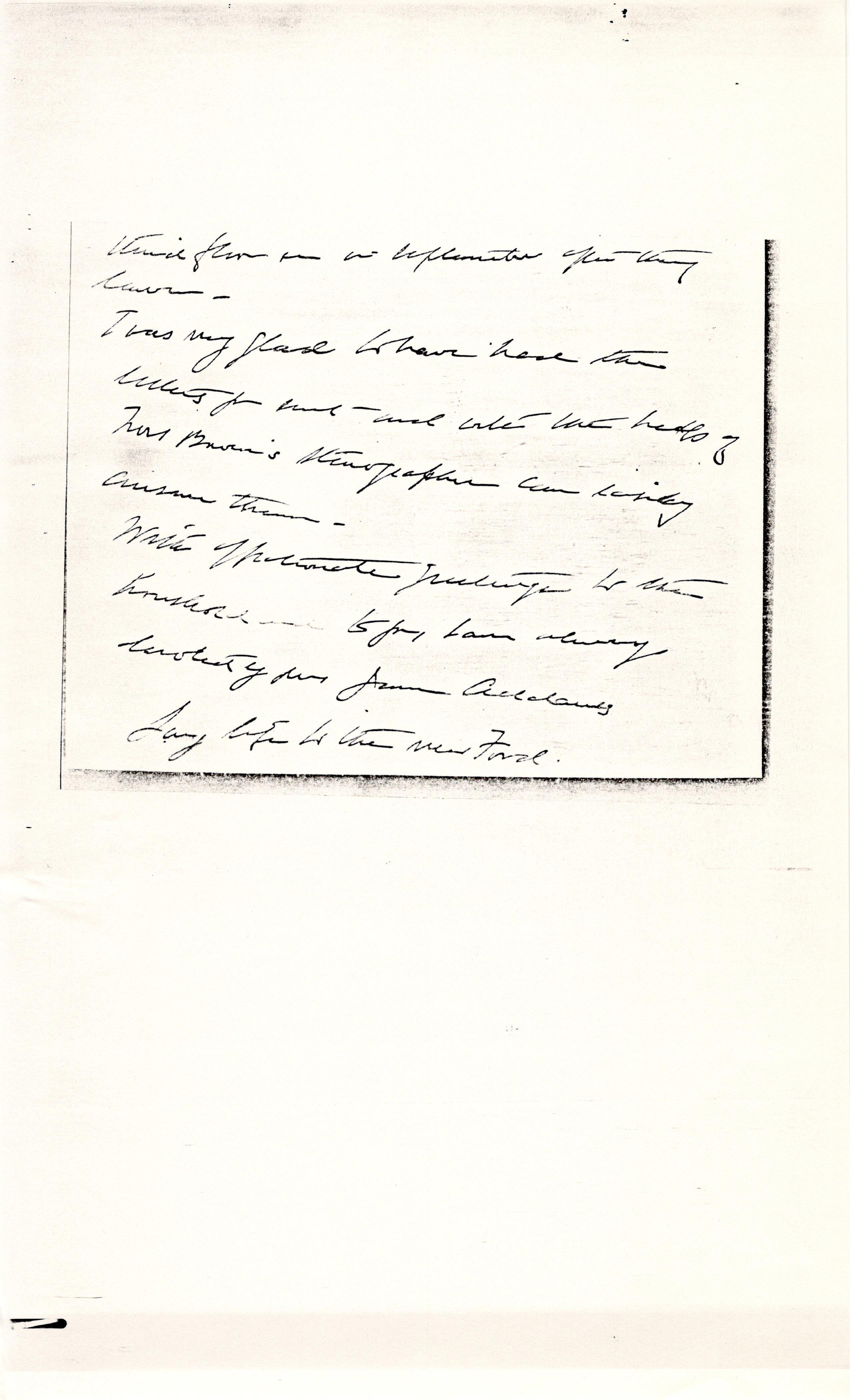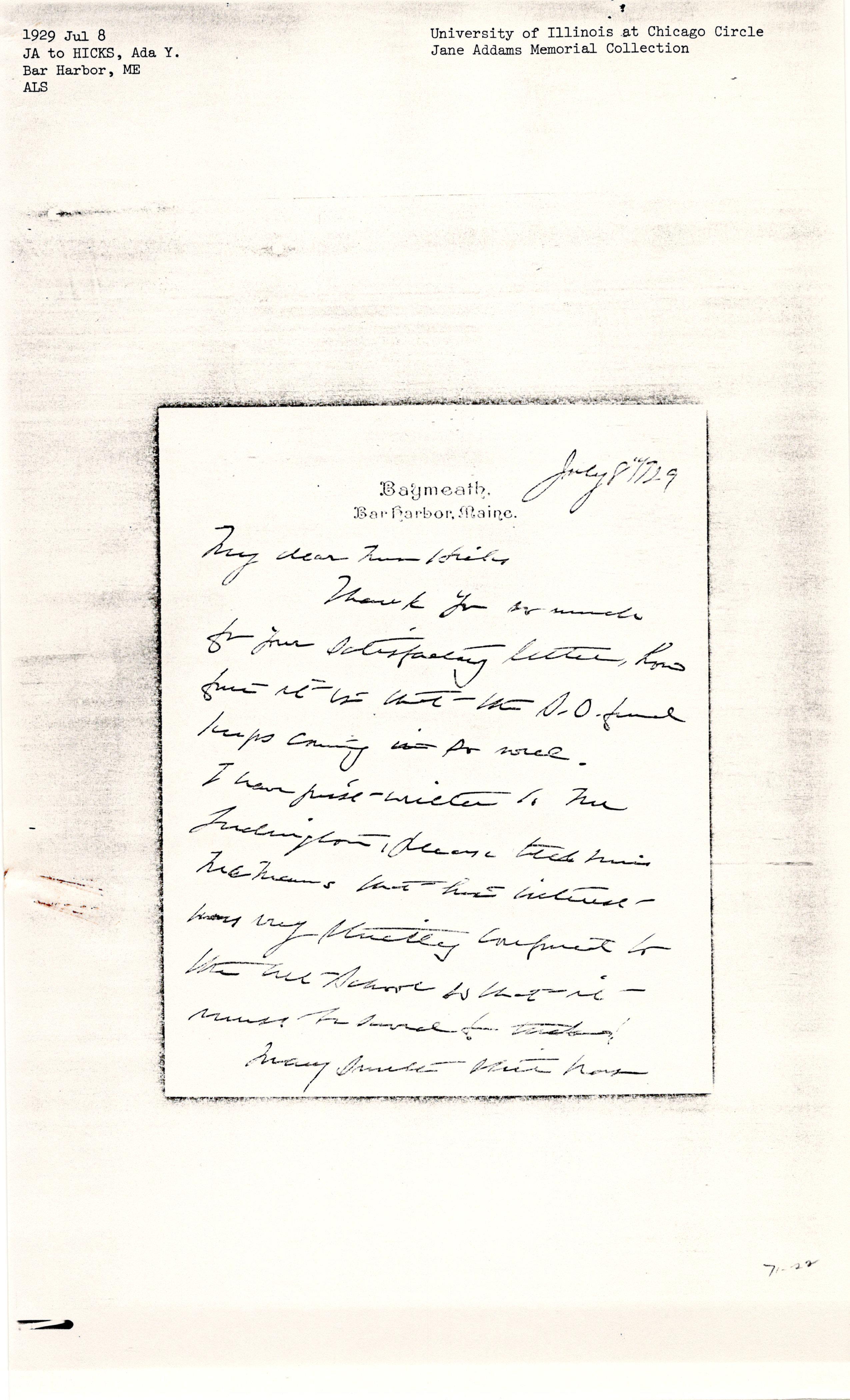 Jane Addams to Ada Medora Yoder Hicks, July 8, 1929