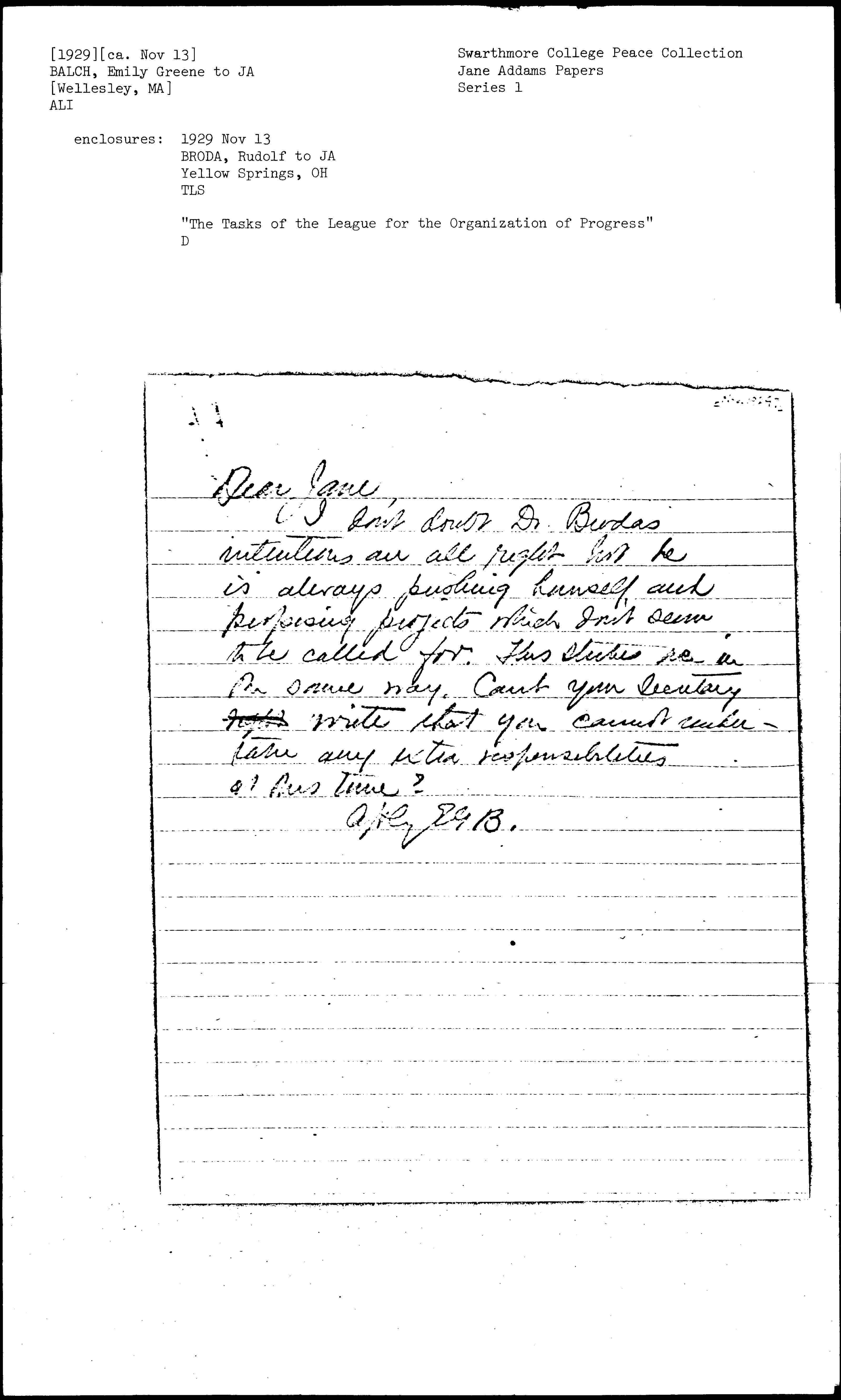 Emily Greene Balch to Jane Addams, ca. November, 13, 1929