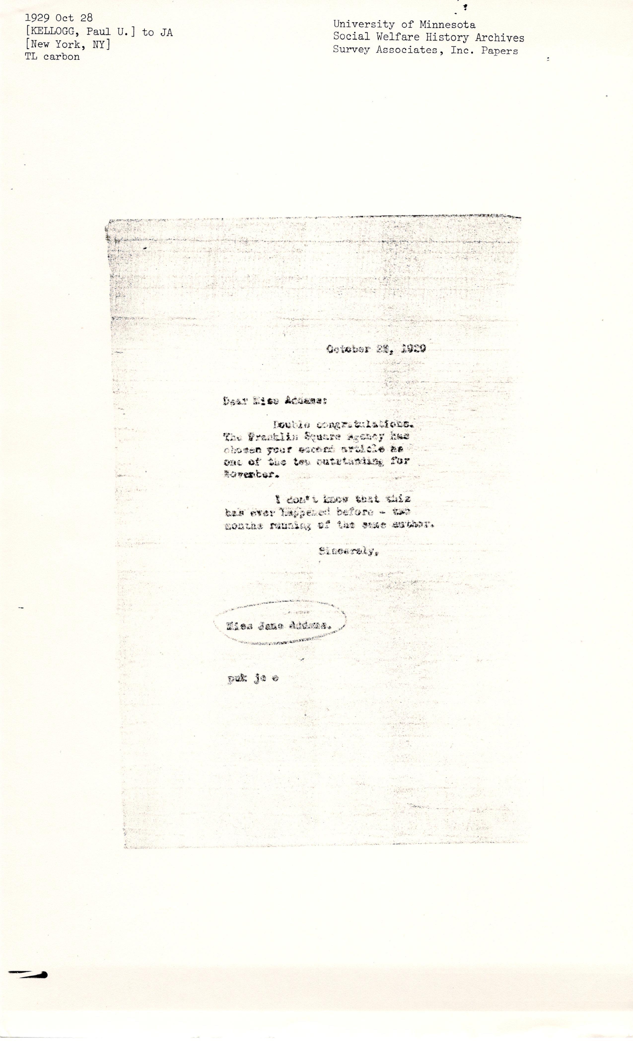 Paul Underwood Kellogg to Jane Addams, October 24, 1929