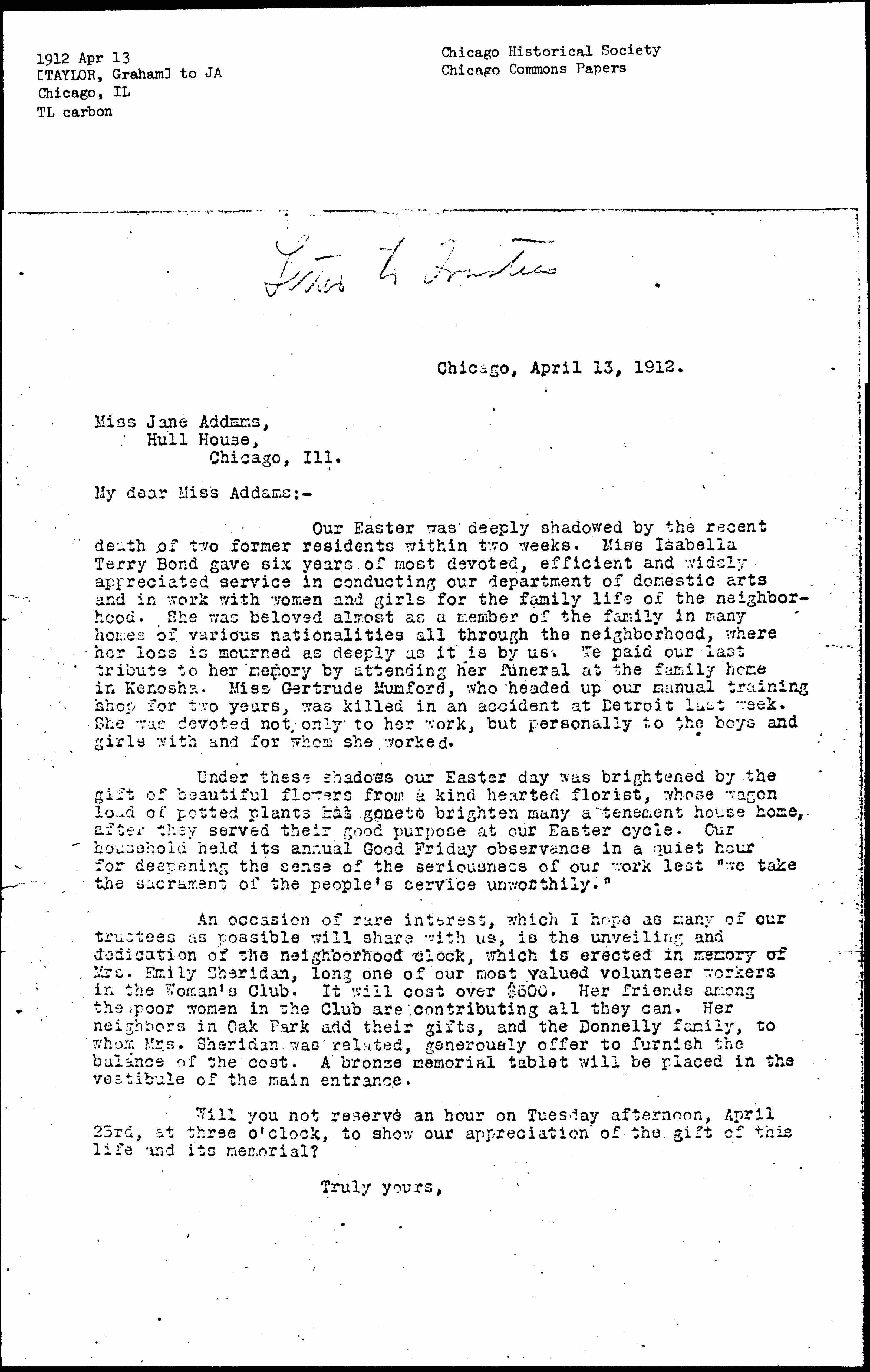 An occasion of rare interest, which I hope as many of our trustees as possible will share with us, is the unveiling and dedication of the neighborhood clock, which is erected in memory of Mrs. Emily Sheridan, long one of our most valued volunteer workers in the Woman's Club. It will cost over $500. Her friends among the poor women in the Club are contributing all they can. Her neighbors in Oak Park add their gifts, and the Donnelly family, to whom Mrs. Sheridan was related, generously offer to furnish the balance of the cost. A bronze memorial tablet will be placed in the vestibule of the main entrance.