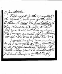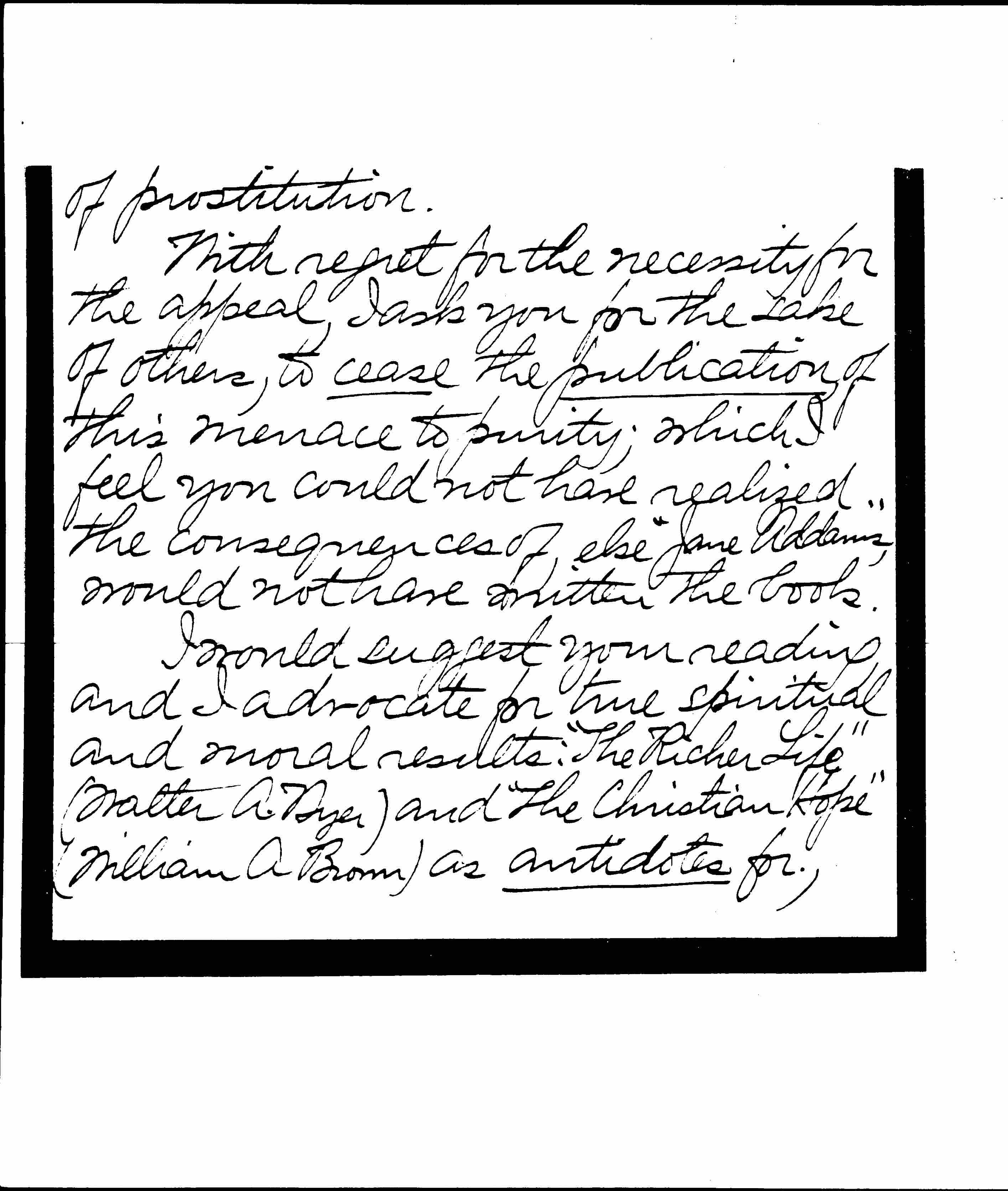 With regret for the necessity for the appeal, I ask you for the sake of others, to cease the publication, of this menace to purity; which I feel you could not have realized the consequences of, else "Jane Addams," would not have written the book.
