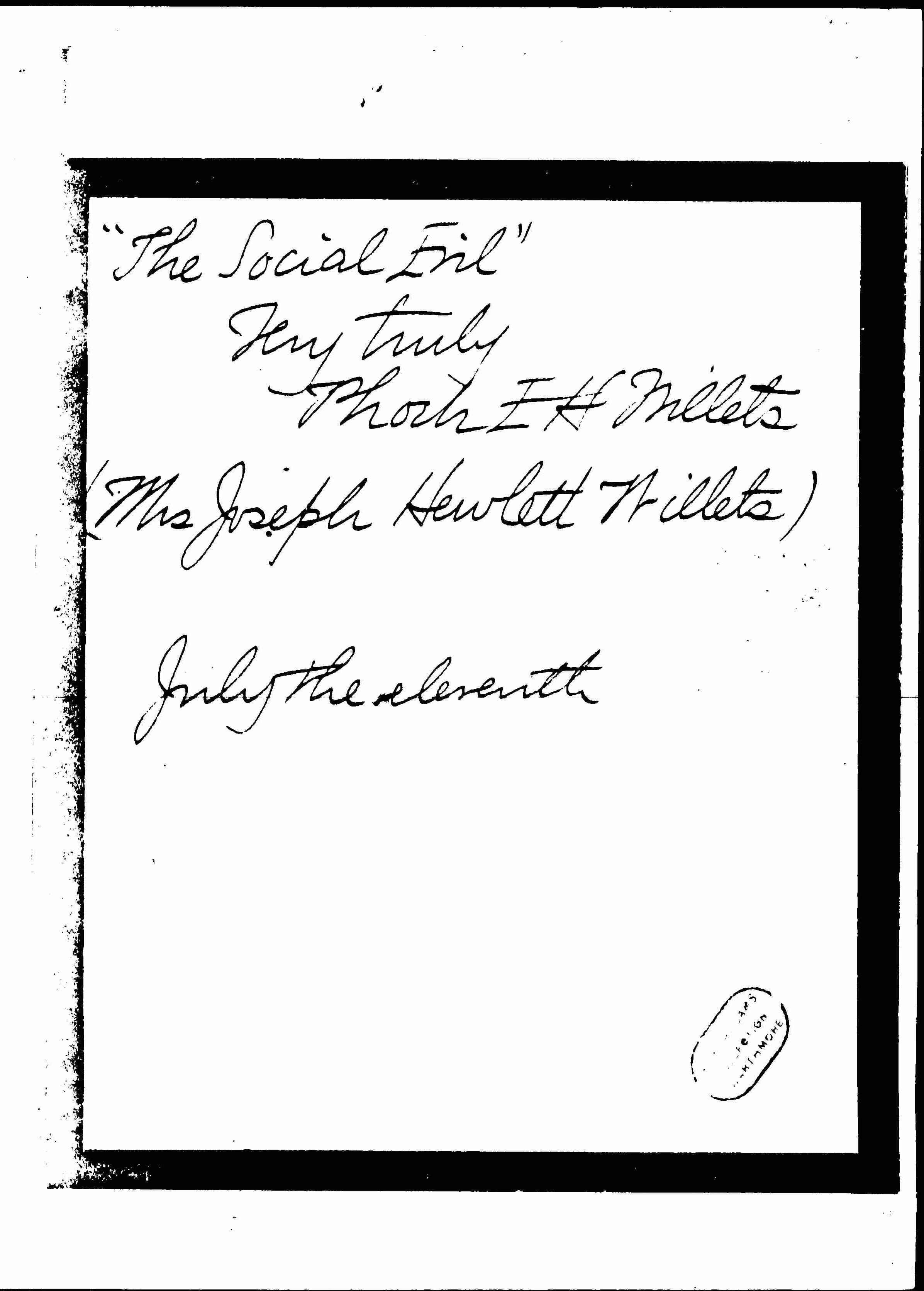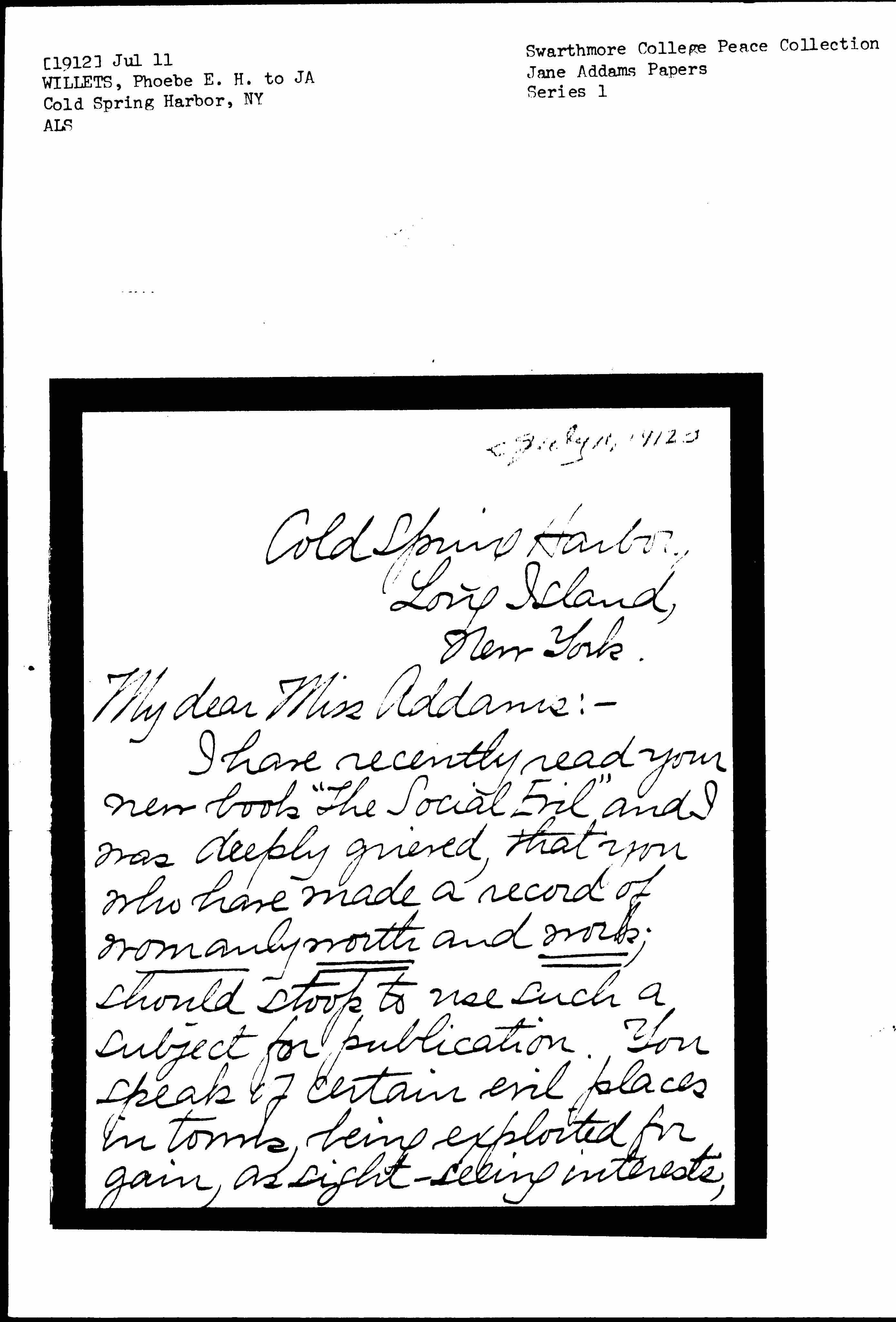 I have recently read your new book "The Social Evil" and I was deeply grieved, that you who have made a record of womanly worth and work; should stoop to use such a subject for publication. You speak of certain evil places in towns, being exploited for gain, as sight-seeing interests, [page 2] for out of town visitors. Your book is another example of this method of money getting; is it not?