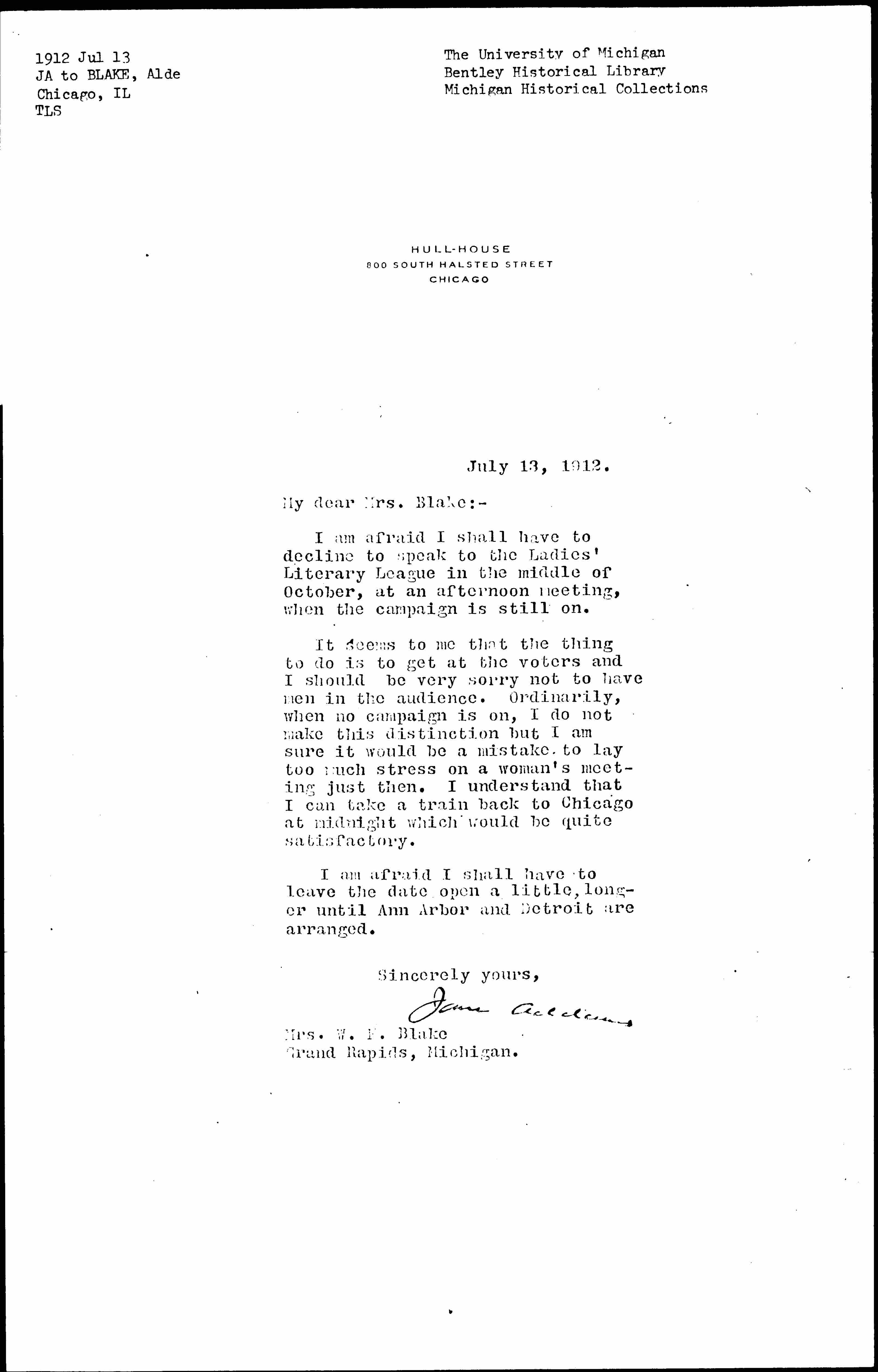It seems to me that the thing to do is to get at the voters and I should be very sorry not to have men in the audience. Ordinarily, when no campaign is on, I do not make this distinction but I am sure it would be a mistake to lay too much stress on a woman's meeting just then. I understand that I can take a train back to Chicago at midnight which would be quite satisfactory.
