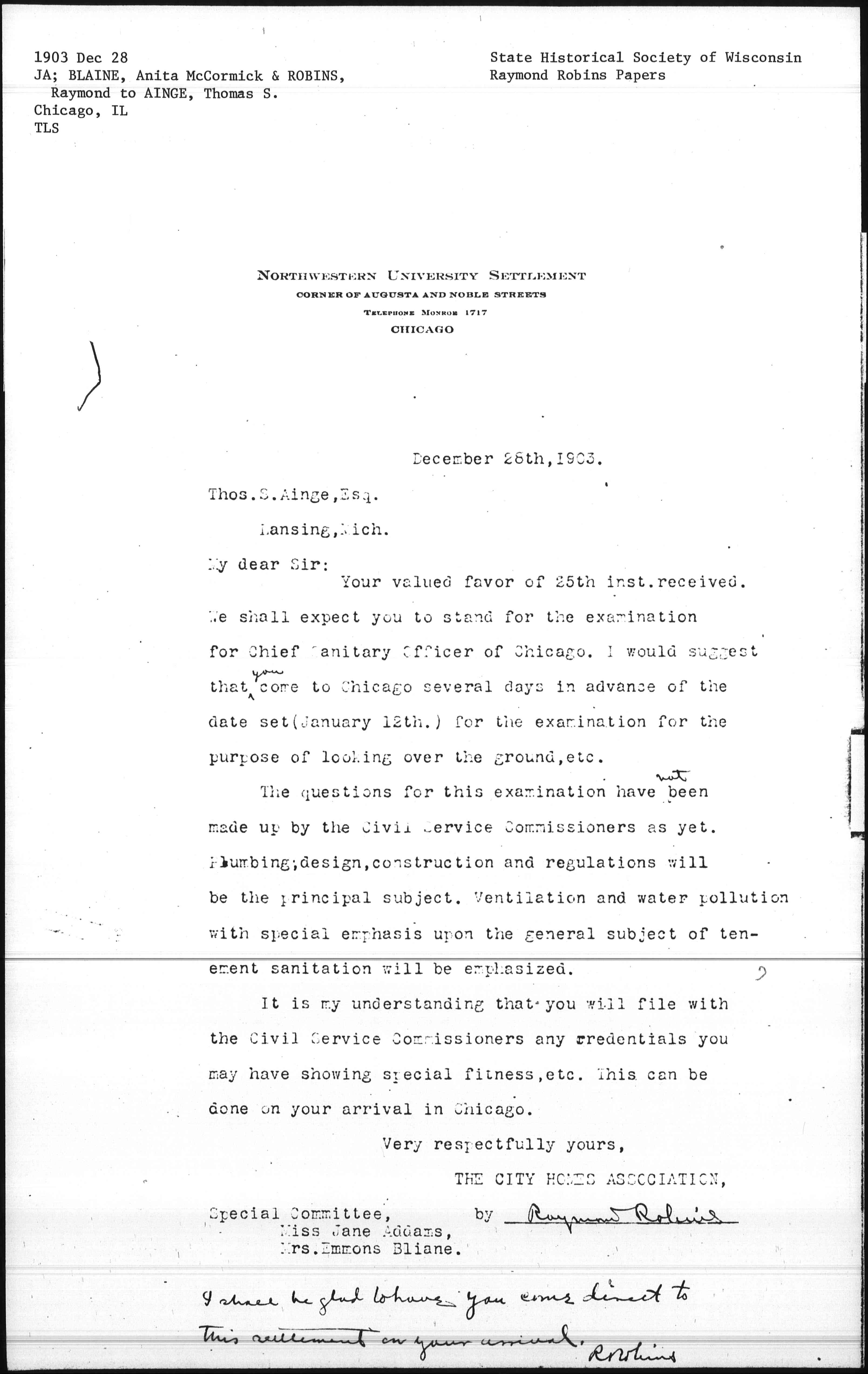 Your valued favor of 25th inst. received. We shall expect you to stand for the examination for Chief Sanitary Officer of Chicago. I would suggest that <you> come to Chicago several days in advance of the date set (January 12th) for the examination for the purpose of looking over the ground, etc.