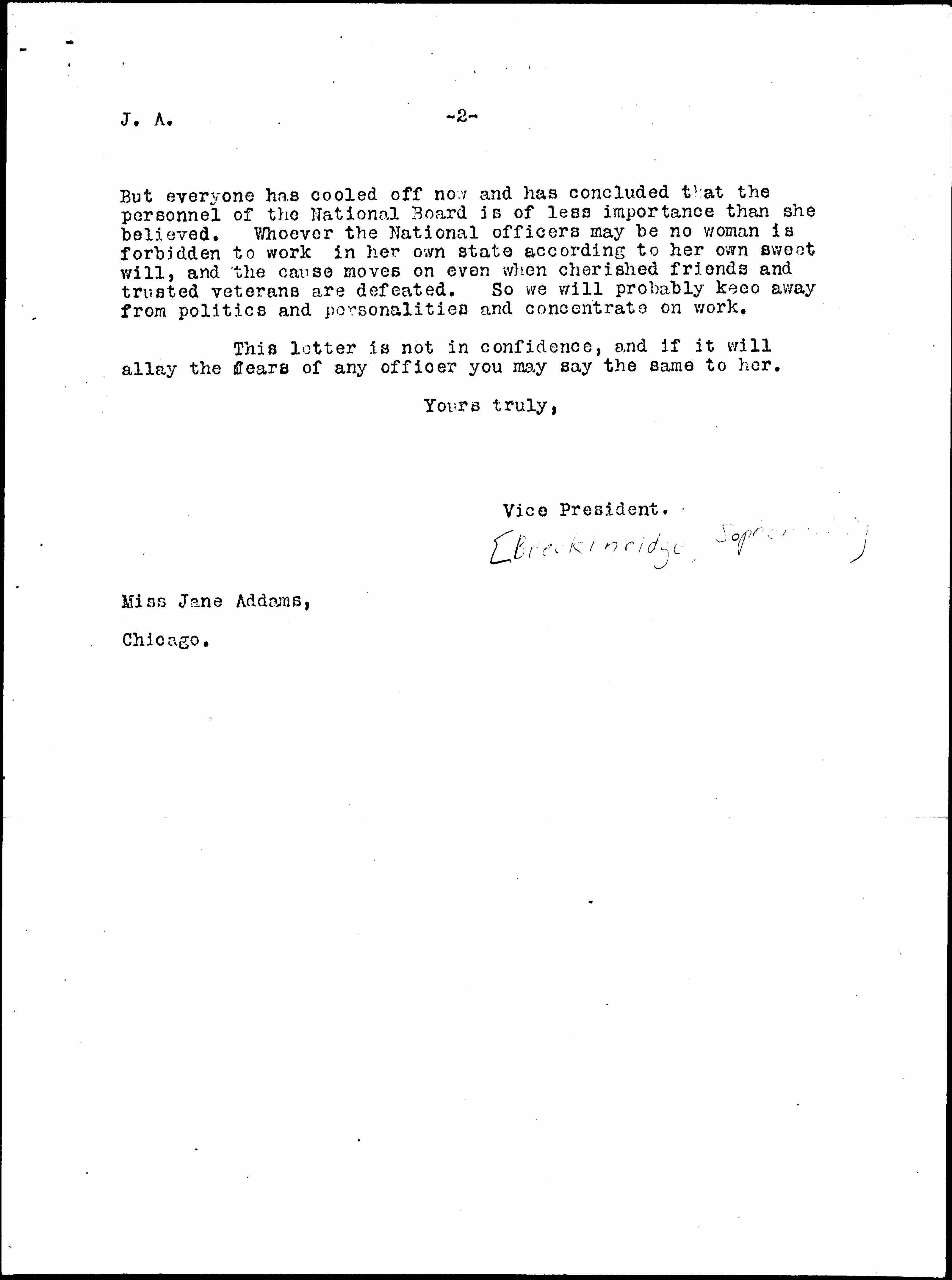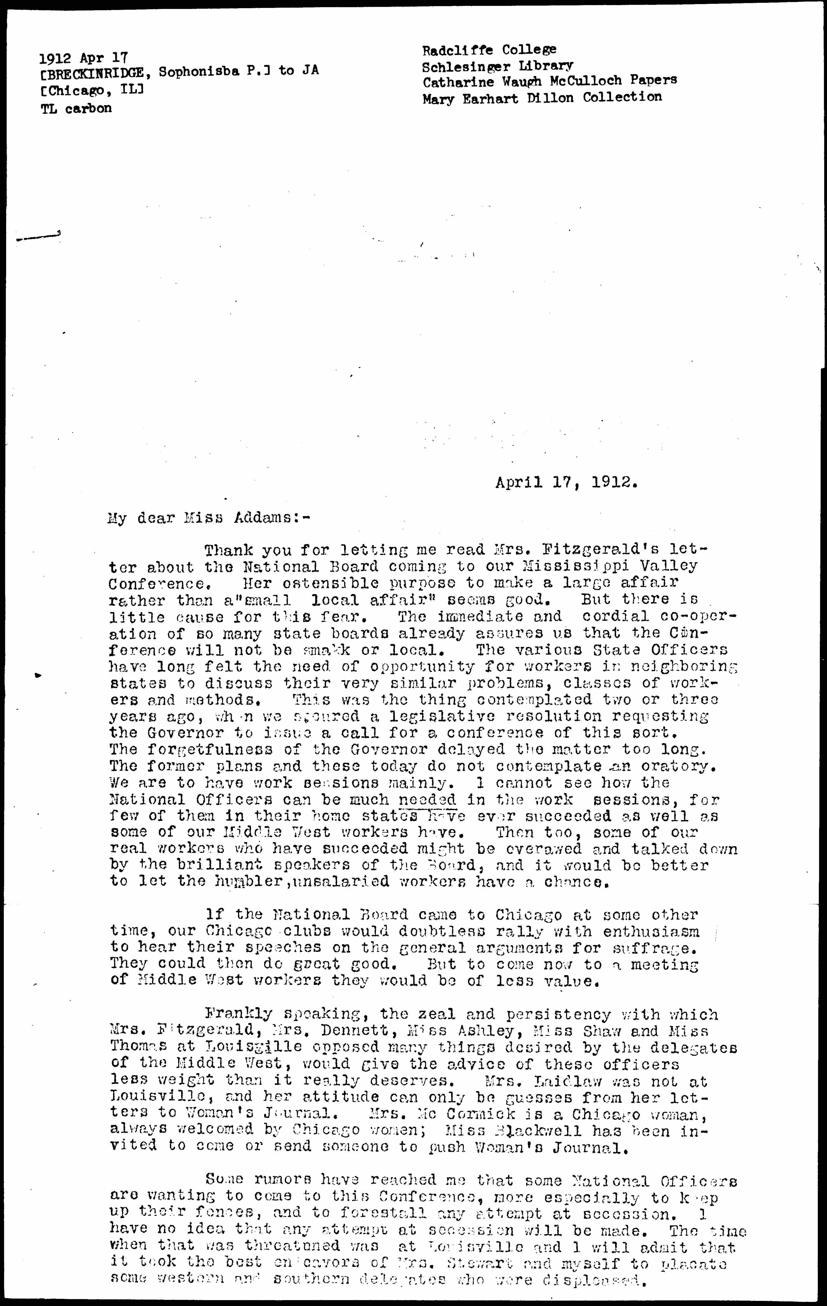 Frankly speaking, the zeal and persistency with which Mrs. [FitzGerald], Mrs. Dennet, Miss Ashley, Miss Shaw and Miss Thomas at Louisville opposed many things desired by the delegates of the Middle West, would give the advice of these officers less weight than it really deserves. Mrs. Laidlaw was not at Louisville, and her attitude can only be guesses from her letters to Woman's Journal. Mrs. McCormick is a Chicago woman, always welcomed by Chicago women; Miss Blackwell has been invited to come or send someone to push Woman's Journal.