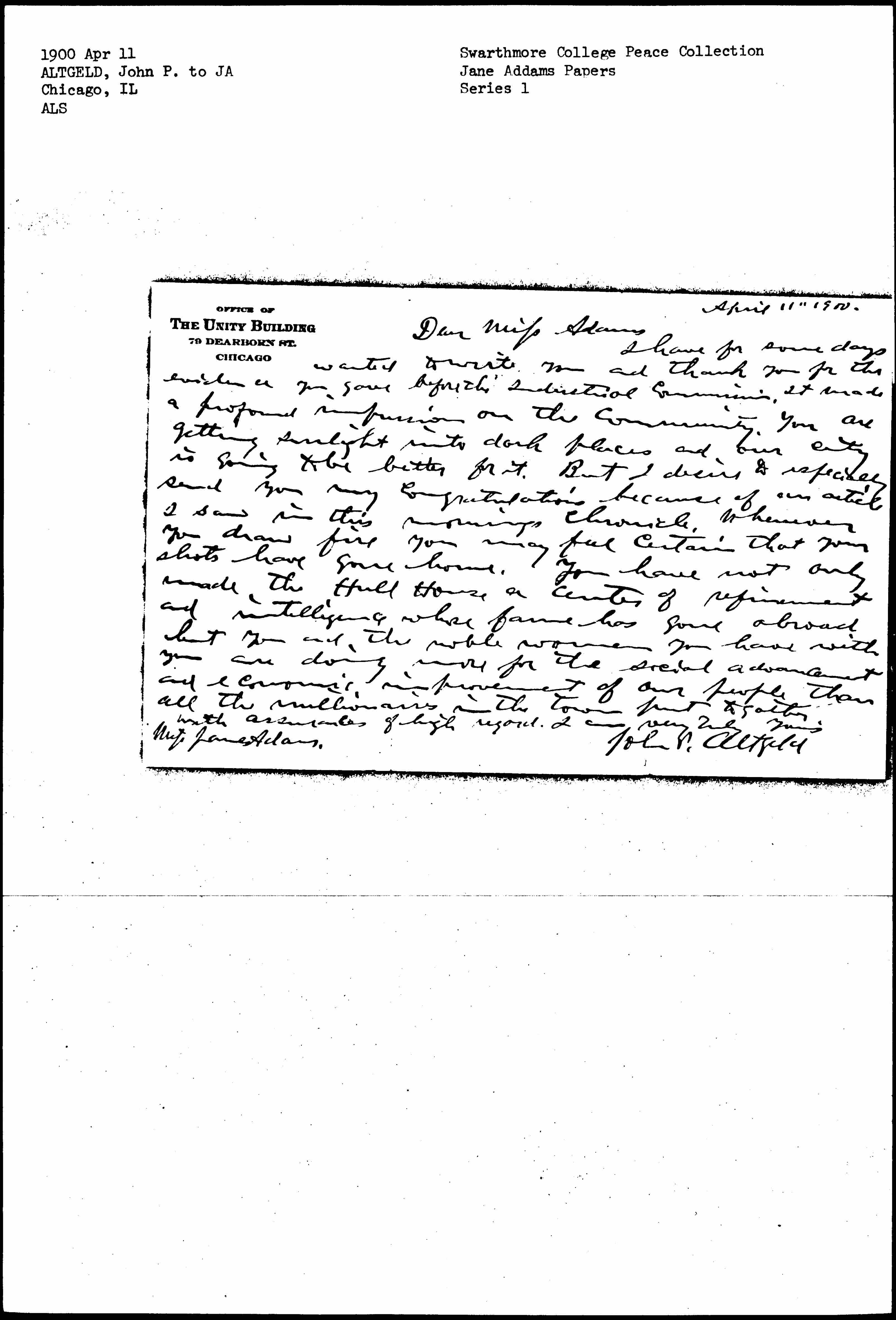 John Peter Altgeld to Jane Addams, April 11, 1900