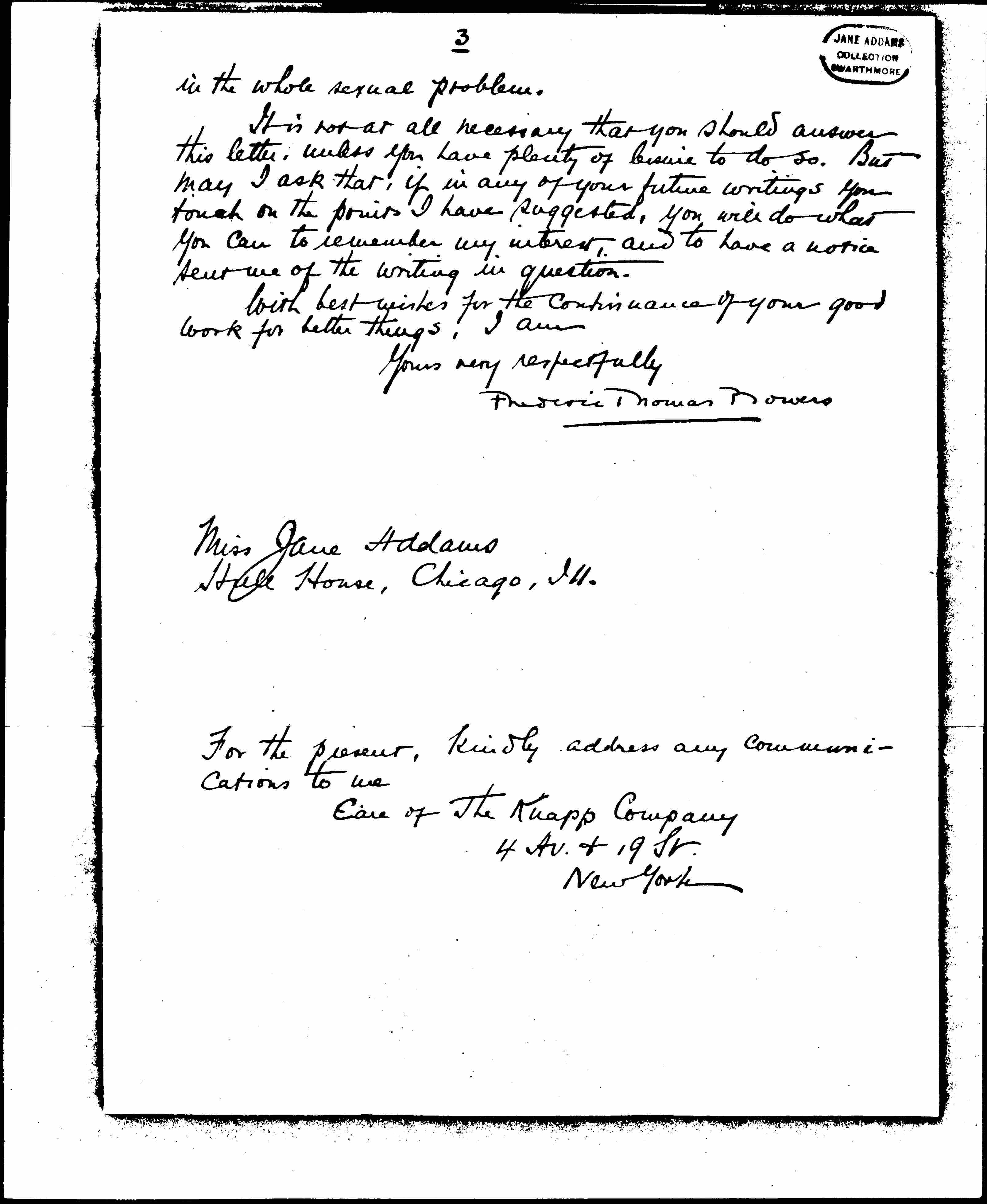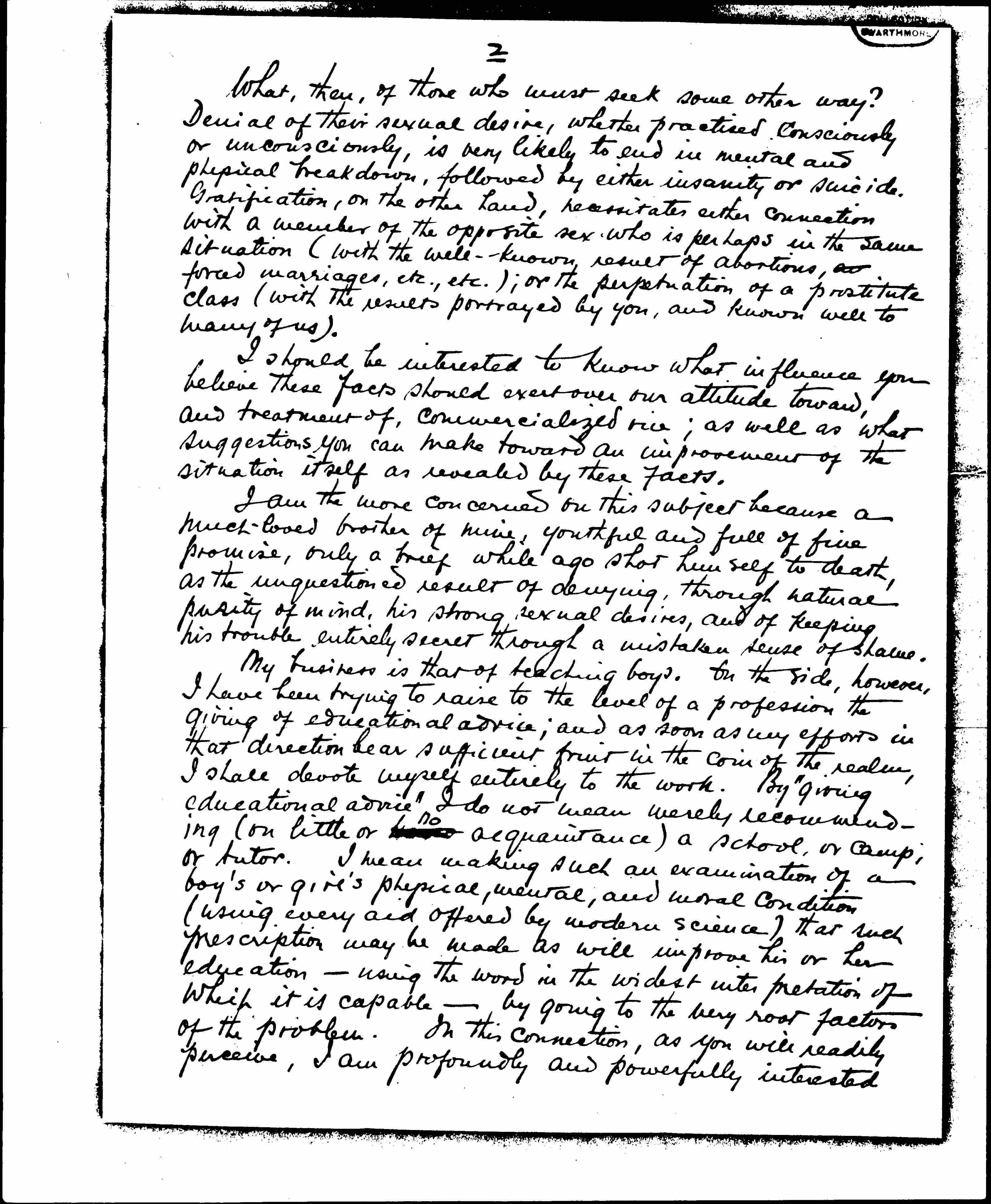 My business is that of teaching boys. On the side, however, I have been trying to raise to the level of a profession the giving of educational advice; and as soon as my efforts in that direction bear sufficient fruit in the coin of the realm, I shall devote myself entirely to the work. By "giving educational advice" I do not mean merely recommending (on little or [illegible] <no> acquaintance) a school, or camp, or tutor. I mean making such an examination of a boy's or girl's physical, mental, and moral condition (using every aid offered by modern science) that such prescription may be made as will improve his or her education -- using the word in the widest interpretation of which it is capable -- by going to the very root factors of the problem. In this connection, as you will readily perceive, I am profoundly and powerfully interested [page 3] in the whole sexual problem.