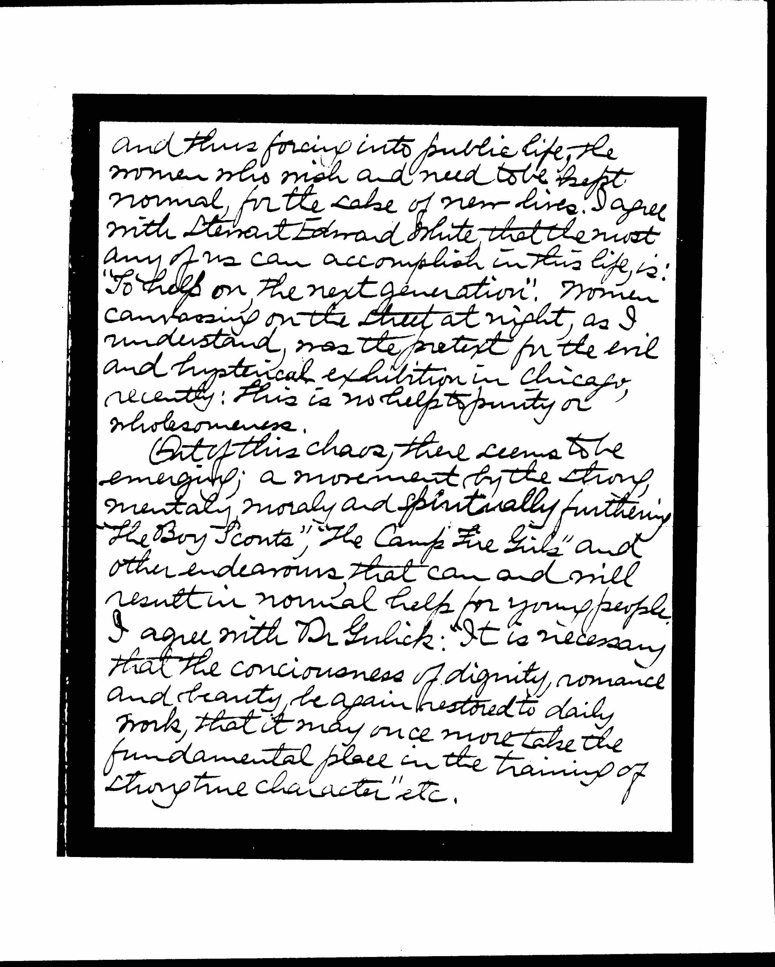 Out of this chaos, there seems to be emerging; a movement by the strong, [mentally], [morally] and spiritually furthering "The Boy Scouts," "The Camp Fire Girls" and other [endeavors], that can and will result in normal help for young people. I agree with Dr. Gulick: "It is necessary that the [consciousness] of dignity, romance and beauty, be again restored to daily work, that it may once more take the fundamental place in the training of strong true character" etc. [page 5]