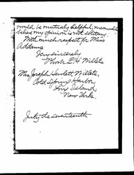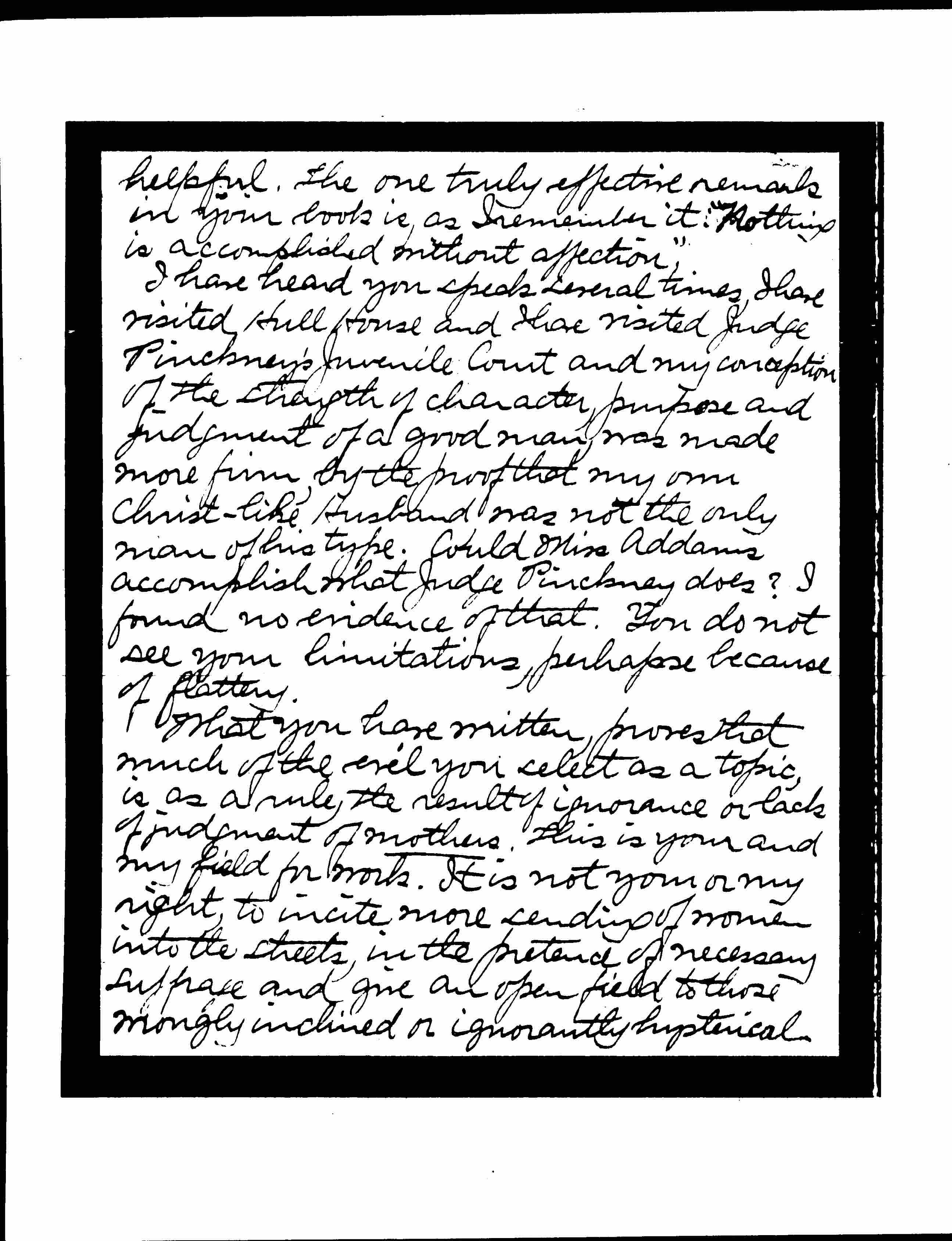 I have heard you speak several times, I have visited Hull House and I have visited Judge Pinckney's Juvenile Court and my conception of the strength of character, purpose and judgment of a good man, was made more firm, by the proof that my own Christ-like Husband was not the only man of his type. Could Miss Addams accomplish what Judge Pinckney does? I found no evidence of that. You do not see your limitations, [perhaps] because of flattery.