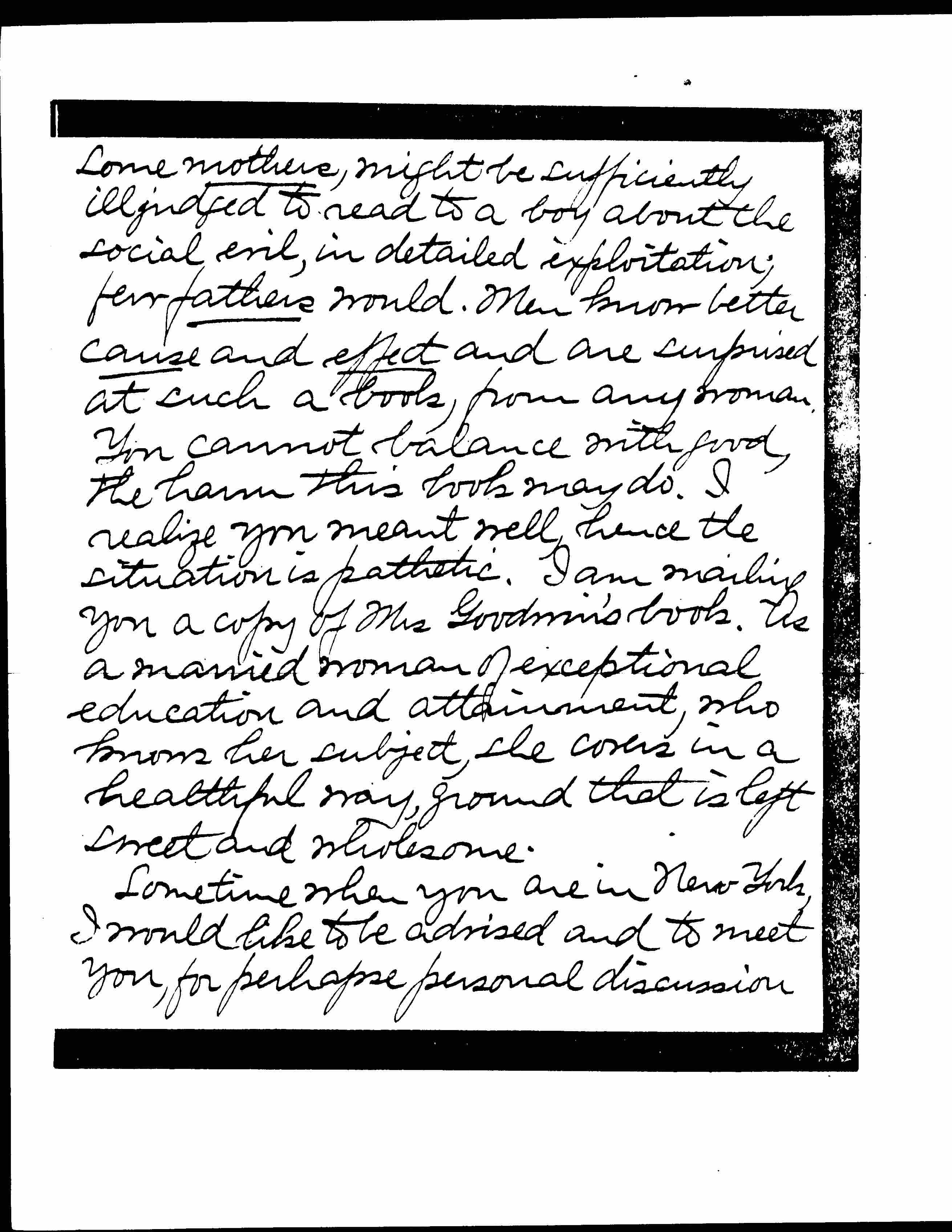 Some mothers, might be sufficiently ill judged to read to a boy about the social evil, in detailed exploitation; few fathers would. Men know better cause and effect and are surprised at such a book, from any woman. You cannot balance with good, the harm this book may do. I realize you meant well, hence the situation is pathetic. I am mailing you a copy of Mrs. Goodman's book. As a married woman of exceptional education and attainment, who knows her subject, she covers in a healthful way, ground that is left sweet and wholesome.