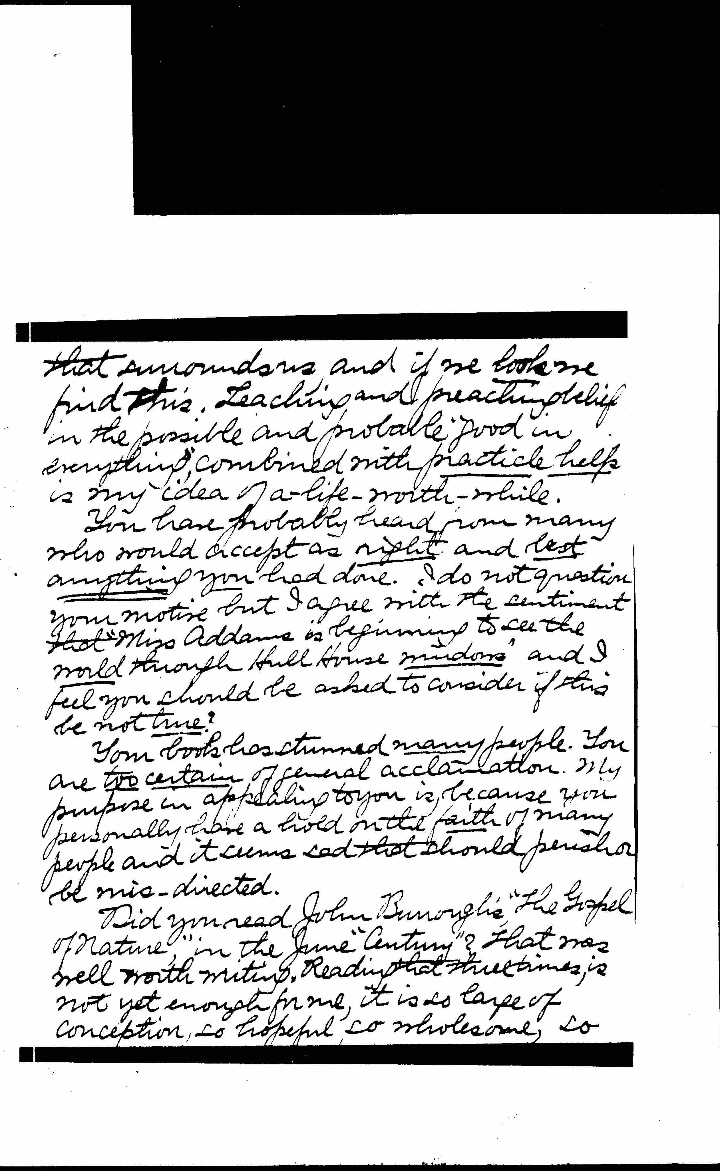 Did you read John Burroughs' "The Gospel of Nature," in the June "Century"? That was well worth writing. Reading that three times, is not yet enough for me, it is so large of conception, so hopeful, so wholesome, so [page 3] helpful. The one truly effective remark in your book is, as I remember it: "Nothing is accomplished without affection."