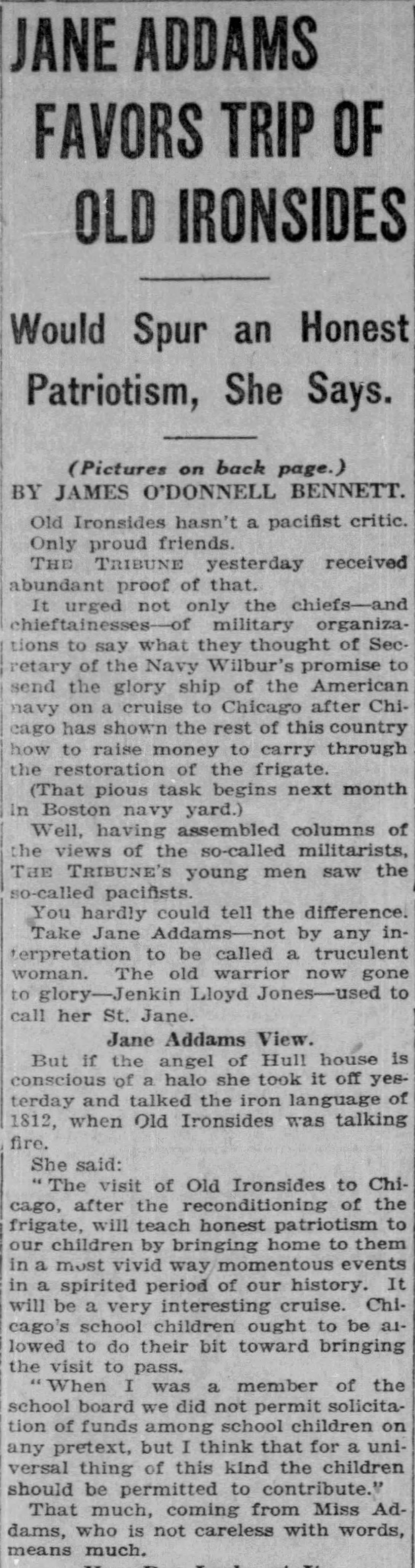 "The visit of Old Ironsides to Chicago, after the reconditioning of the frigate, will teach honest patriotism to our children by bringing home to them in a most vivid way momentous events in a spirited period of our history. It will be a very interesting cruise. Chicago's school children ought to be allowed to do their bit toward bringing the visit to pass.